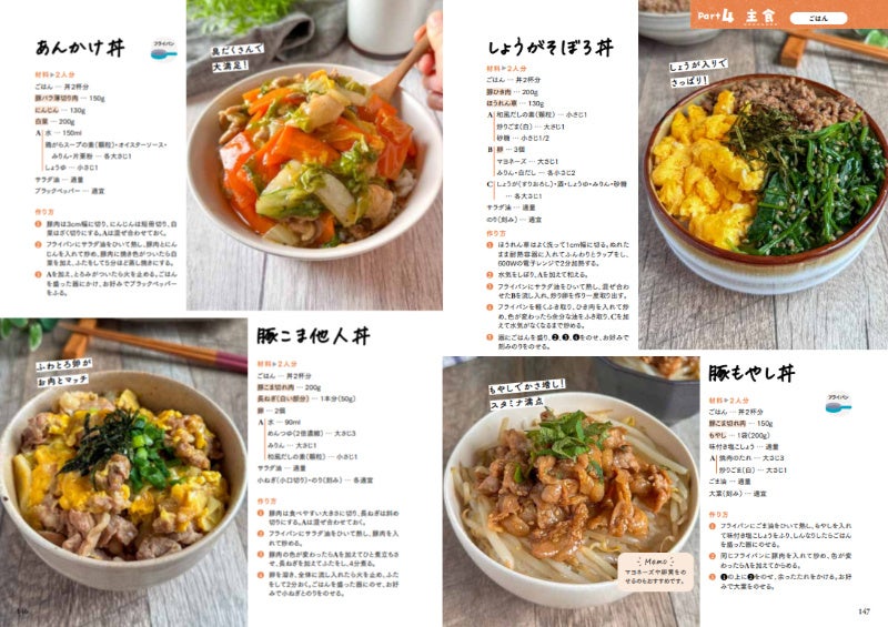 このパートでは、豚肉や鶏肉、魚の切り身などを使った、ボリューム満点のおかずを集めています。難しい工程は一切なしであっという間に完成します。メインとなる食材ごとに掲載されているので、その日に食べたい肉や魚介から何を作るか決められます。