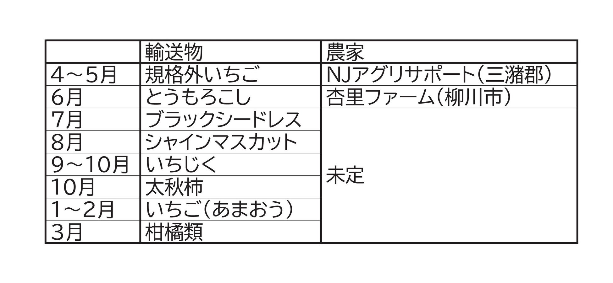 西鉄電車沿線近郊で収穫された野菜や果物を、電車に乗せて(※)運び、沿線のにしてつストア店舗で販売します。