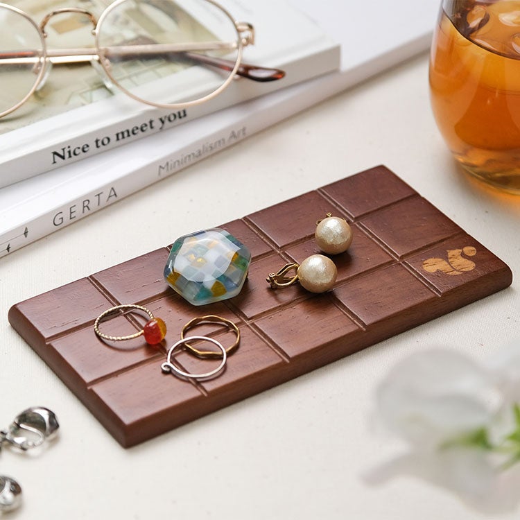 デザイナーコメント「まるで板チョコのようなオリジナル木製トレーです。アクセントにスナックミーのロゴを焼印しました。色あいや大きさはチョコそっくりで、パキッと折って食べられそうなほど。マグカップとちょっとしたおやつが置けるサイズ感なので、ほっとひと息つく時間にぴったりです。」