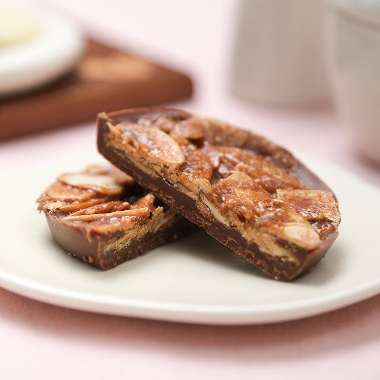 フロランタンのあたま チョコまみれ:キャラメル×アーモンドスライスの香ばしい「あたま」部分を、濃厚なチョコレートでコーティングしました。ひと口目はカリッと、あとからチョコのコクがとろりと広がります。