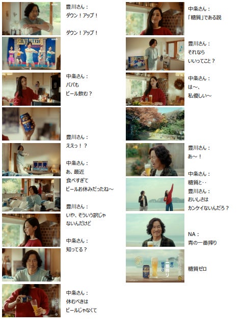 テレビでトレーニング動画を見ながら筋トレに励む豊川さんを横目に、冷蔵庫から「一番搾り 糖質ゼロ」を取り出し、「パパもビール飲む?」と何気なく話しかけた中条さん。その直後、最近父が大好きなビールを控えていることを思い出した娘は、残念そうに背中を向けた豊川さんに「知ってる?」「休むべきはビールじゃなくて“糖質”である説!」と呼びかけます。すると、振り返って中条さんの手元を指差し「それならいいってこと?」と期待を膨らませる豊川さん。庭のデッキに仲良く腰掛けて、一緒に「一番搾り 糖質ゼロ」を飲み、思わずそのおいしさを認めてしまうのでした。相変わらず息ぴったりな父と娘の掛け合いをはじめ、娘からの思いも寄らない提案を受け入れて、うれしそうにビールを飲む豊川さん、父の心の機微を捉えた中条さんの印象的な言動や表情など、見どころが詰まった新 CM にご注目ください。