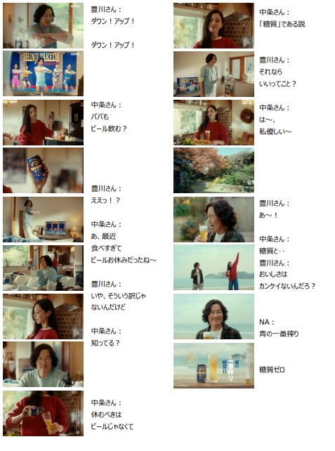 テレビでトレーニング動画を見ながら筋トレに励む豊川さんを横目に、冷蔵庫から「一番搾り 糖質ゼロ」を取り出し、「パパもビール飲む?」と何気なく話しかけた中条さん。その直後、最近父が大好きなビールを控えていることを思い出した娘は、残念そうに背中を向けた豊川さんに「知ってる?」「休むべきはビールじゃなくて“糖質”である説!」と呼びかけます。すると、振り返って中条さんの手元を指差し「それならいいってこと?」と期待を膨らませる豊川さん。庭のデッキに仲良く腰掛けて、一緒に「一番搾り 糖質ゼロ」を飲み、思わずそのおいしさを認めてしまうのでした。相変わらず息ぴったりな父と娘の掛け合いをはじめ、娘からの思いも寄らない提案を受け入れて、うれしそうにビールを飲む豊川さん、父の心の機微を捉えた中条さんの印象的な言動や表情など、見どころが詰まった新 CM にご注目ください。