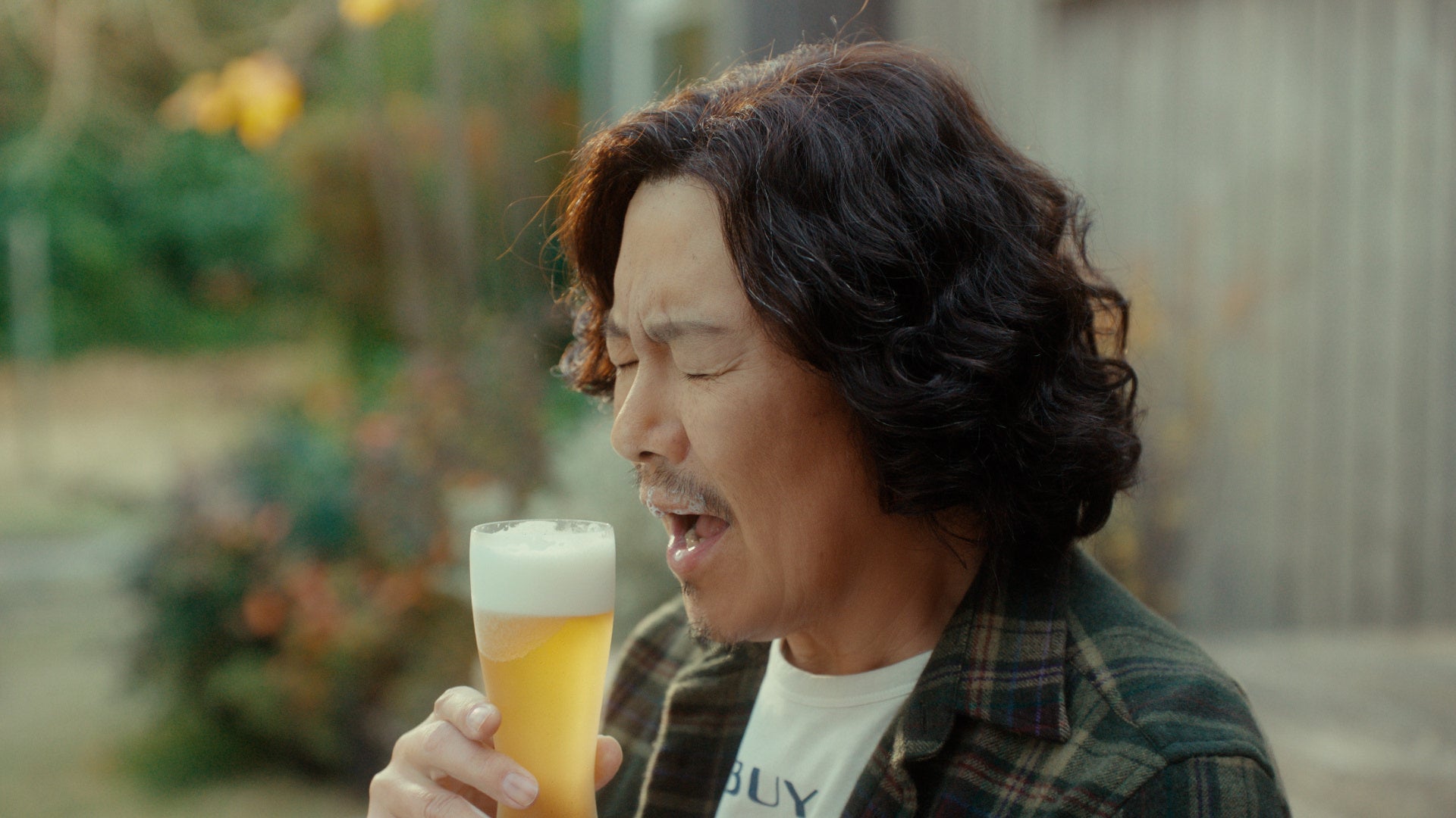 「休むべきはビールじゃなくて糖質である説!」という娘の言葉に反応した豊川さんが、中条さんの手元の「一番搾り 糖質ゼロ」を見つめながら、「それならいいってこと?」と尋ねるシーン。ここでは、辛い筋トレから解放されるだけでなく、もしかしたら今まで我慢していたビールも飲めるかも、という期待をにじませつつ、娘の前だからこそ胸の内を隠し、あえて少し強気に出るという繊細なお芝居が求められました。豊川さんは監督と熱心に話し合いながら、その場に最もふさわしいニュアンスの演技を追求。父の心の機微をすべて見透かしたかのような中条さんのリアクションと相まって、なんともチャーミングなOK テイクとなりました。