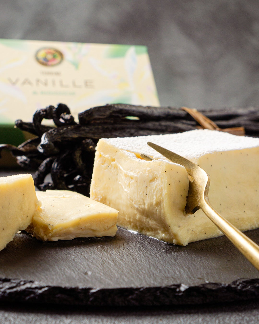 華やかな香りとキャラメルのような甘みが特徴のマダガスカル産ボンボナ種バニラを使用した、バニラショコラチーズケーキ。