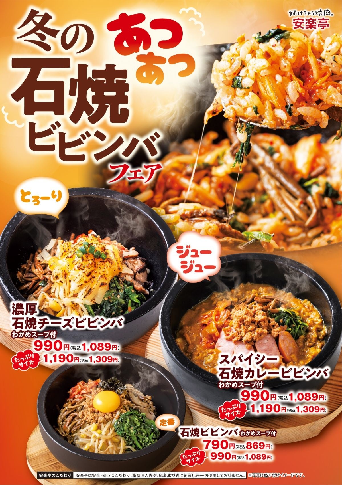 焼肉レストラン 安楽亭(本社:埼玉県さいたま市)は、冬季限定「石焼きビビンバフェア」を2026年1月15日よりスタート。寒さが深まるこの季節、焼肉の香ばしさと、石焼きビビンバの熱気が重なる冬だけの贅沢