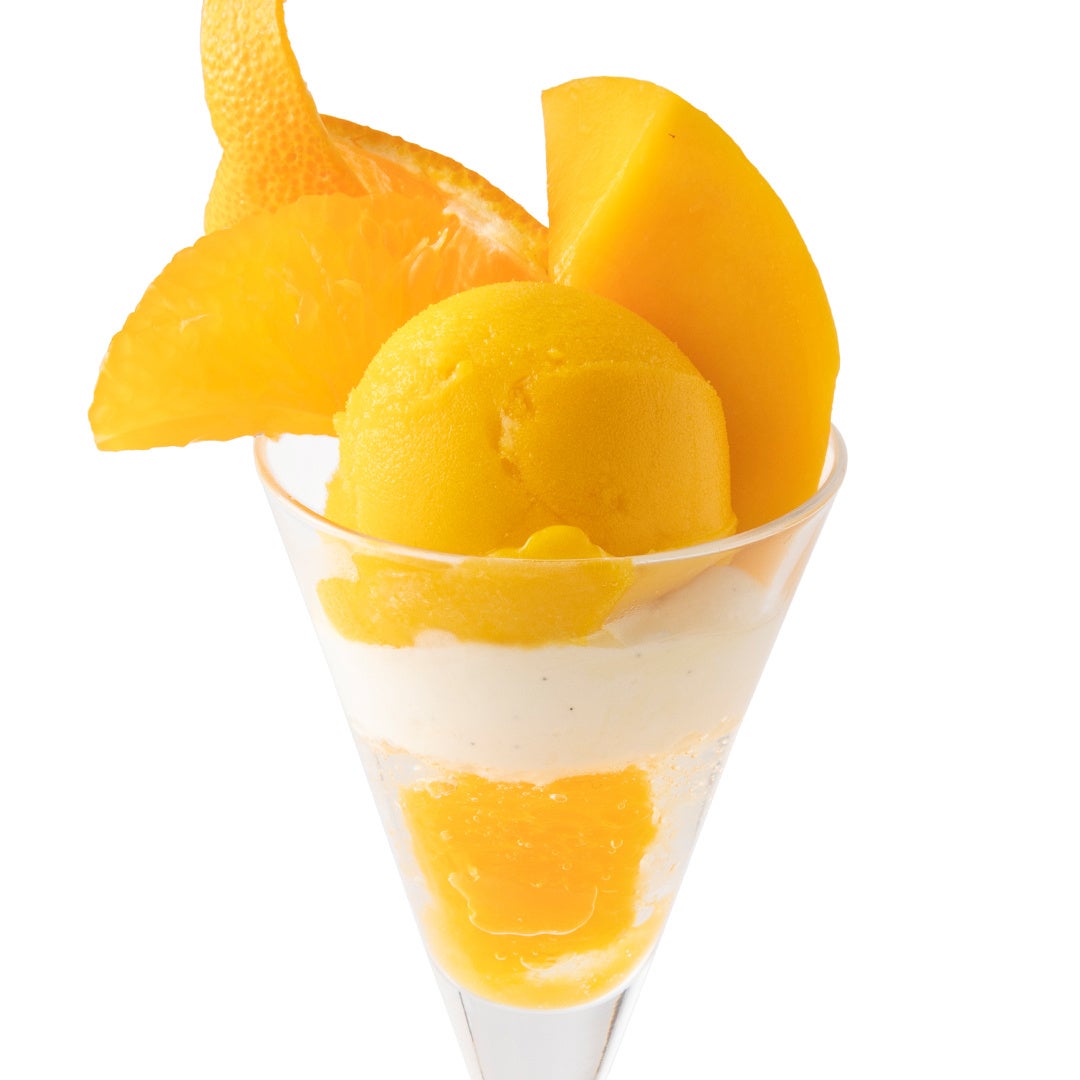 マンゴー特有のトロピカルな香りを感じる店内製造シャーベットと、マンゴーオレンジソース、コアントローゼリー、ディプロマットクリームを重ねたパフェです。