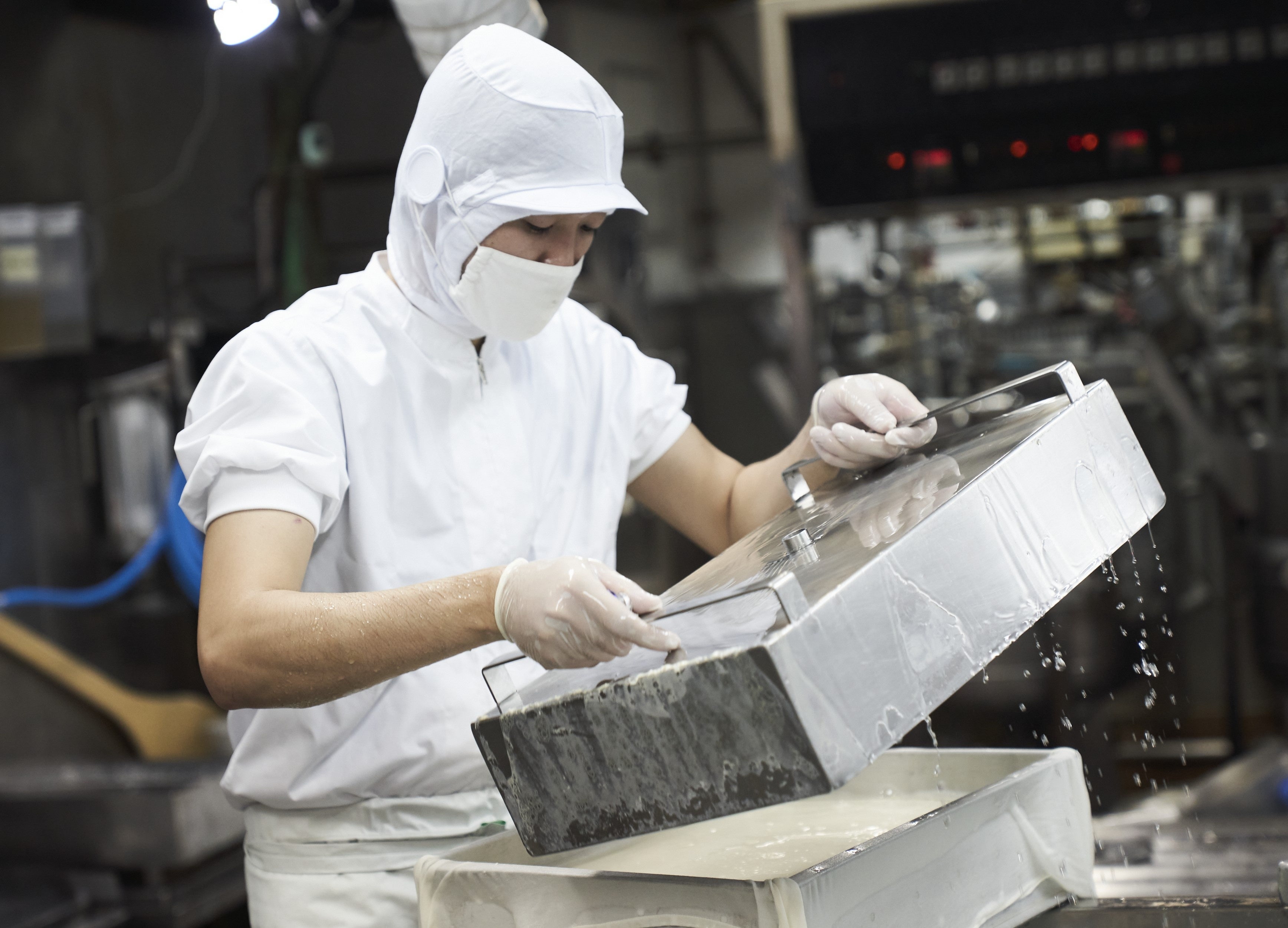 店内からガラス越しに豆腐づくりの作業をご覧いただけます。