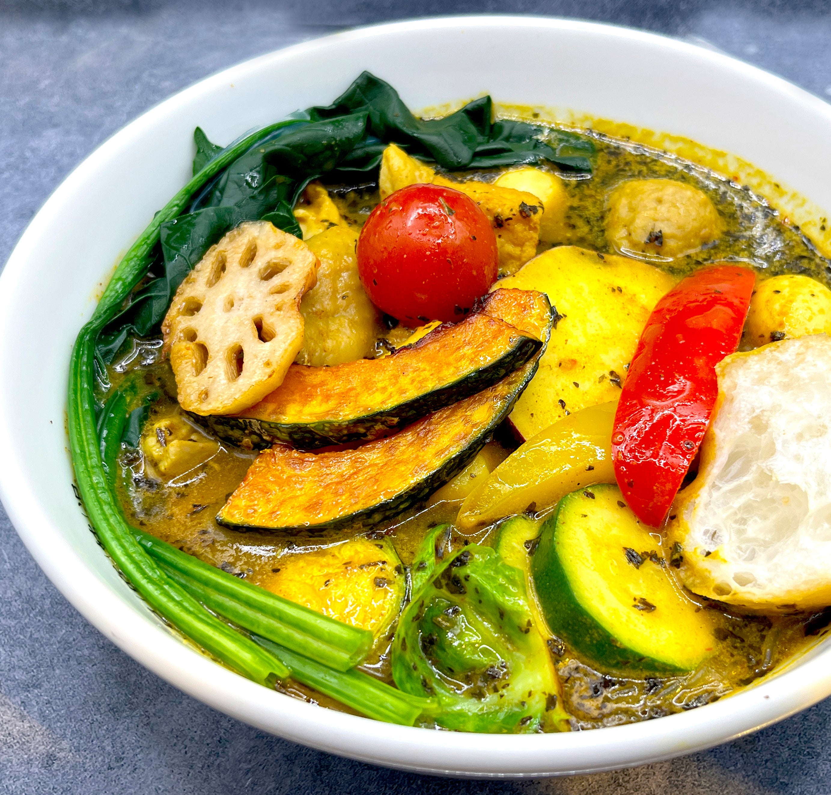 低GI 低カロリーでミネラルや食物繊維が豊富な緑豆春雨麺や、さらに低カロリーで食物繊維が豊富ほぼカロリーゼロと言われダイエットにも有効とされるこんにゃく麺をベースに『身土不二』(身体と土地は一体でありその土地で採れた旬のものを食べることが健康に繋がるという考え)をテーマに地元のお野菜を中心に集めた彩り豊かなトッピング食材をショーケースから自由にチョイスしていただけます!