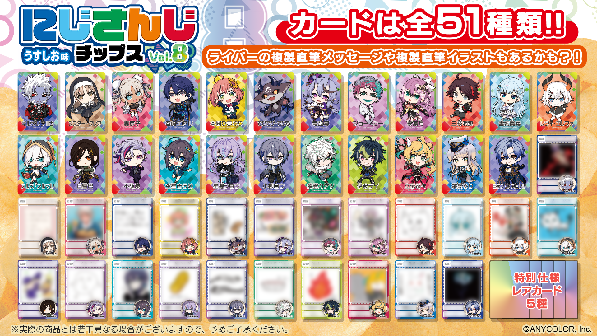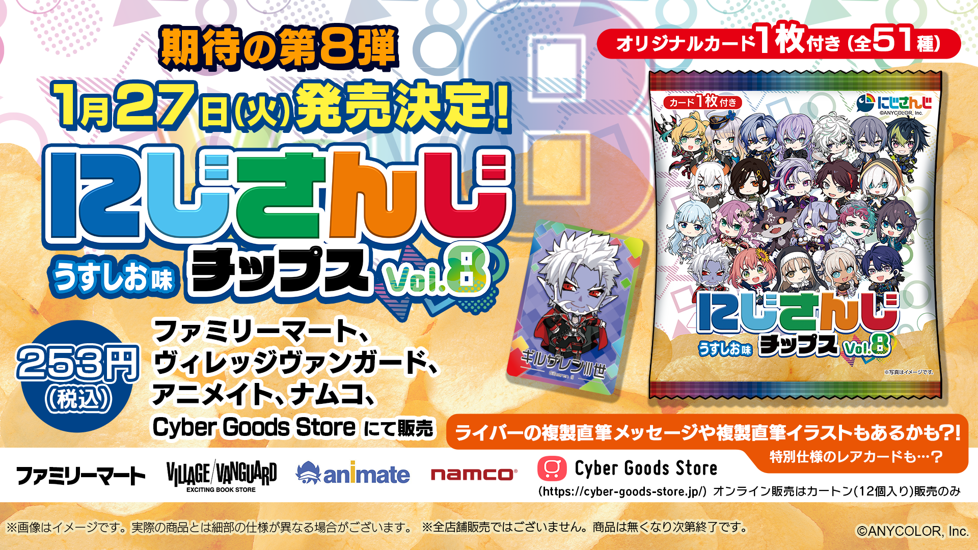 株式会社サイバーエージェント(本社:東京都渋谷区、代表取締役:山内隆裕、東証プライム市場:証券コード4751)は、人気VTuberグループ「にじさんじ」より、オリジナルカード付き『にじさんじチップスvol.8 うすしお味』を2026年1月27日(火)より発売することを決定いたしました。
