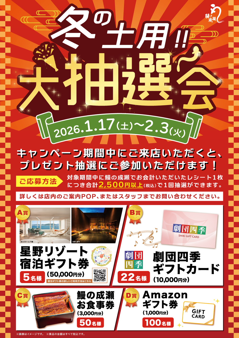 鰻の成瀬では2026年の冬の土用期間に良質な脂やビタミンなどの栄養素も豊富な鰻を食べて元気に過ごしてもらいたいという思いを込めて、このキャンペーンを開催することといたしました。皆さまのご参加をお待ちしております。