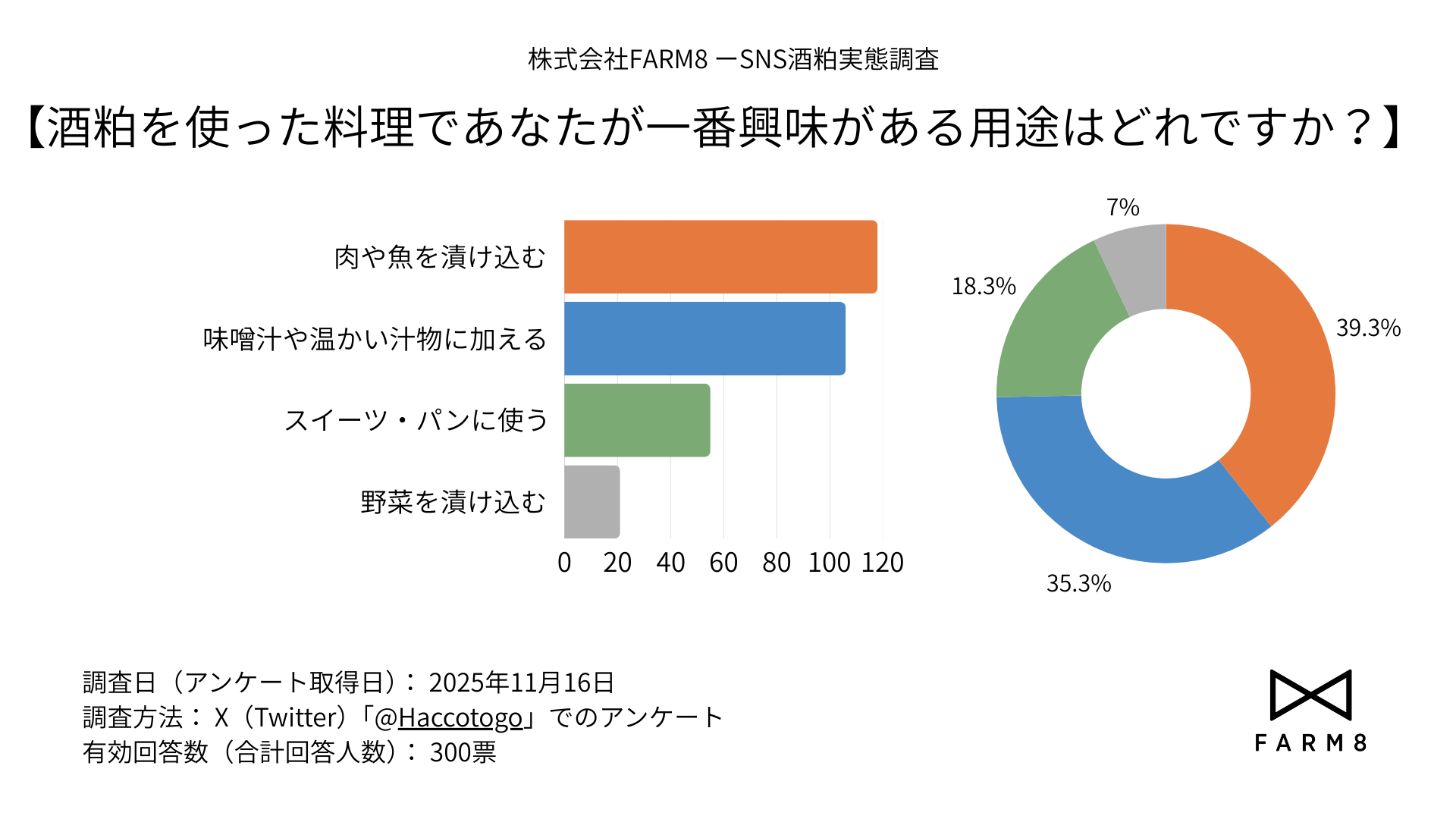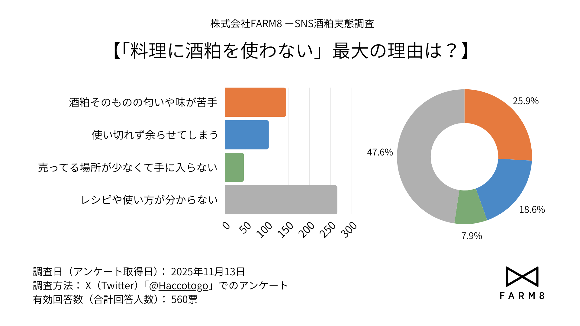 2025年11月にFARM8がSNSで実施したアンケート(回答560件)では、「料理に酒粕を使わない理由」の1位は「レシピや使い方が分からない」(47.5%)でした。