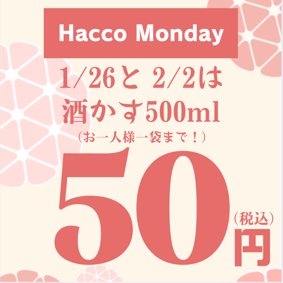 内容:Hacco Monday(酒粕500gを50円販売、(1/26・2/2実施予定)
