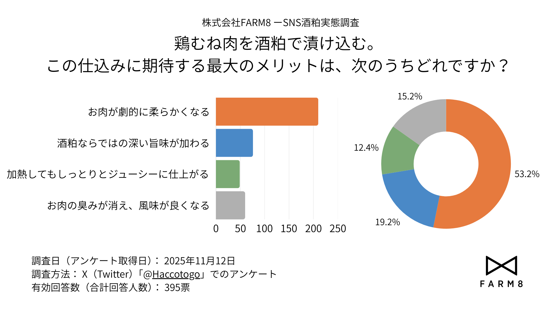 また、「鶏むね肉を酒粕で漬け込む効果」について聞いたアンケートでは、「お肉が劇的に柔らかくなる」(48.2%)がトップ。酒粕の実力は、まだ多くの人に届いていません。