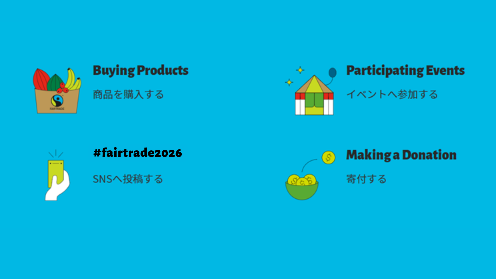 ● 参加方法:フェアトレード商品の購入、#fairtrade2026のSNS投稿、全国のフェアトレード関連イベントへの参加、フェアトレード・ラベル・ジャパンへの寄付、登録レストランでのフェアトレードドリンク・フード購入など、フェアトレードに関するアクションを行う