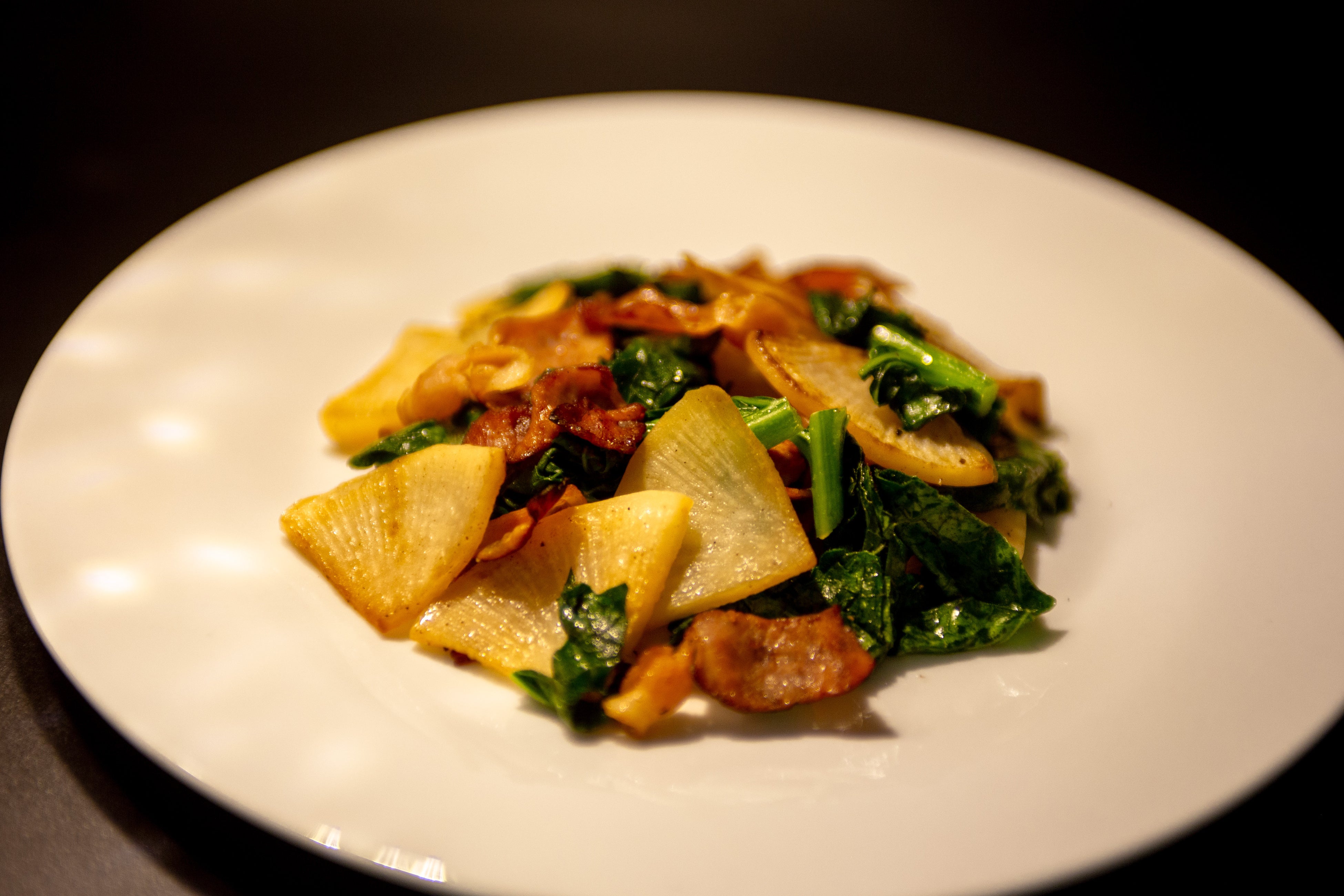 佐波賀だいこんは舞鶴発祥の「京の伝統野菜」であり、その起源は江戸時代にまで遡ります。根元が太く先が尖った独特の形状が特徴。一般的な大根と比べて肉質が硬く、水分が少ないため、揚げ物や大根おろし、煮物などの調理法に適しています 。また、濃い緑色の葉は地表で横に広がり、ボリュームがあるため「佐波賀だいこん菜」としても親しまれています。