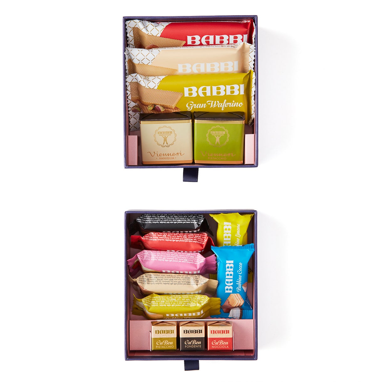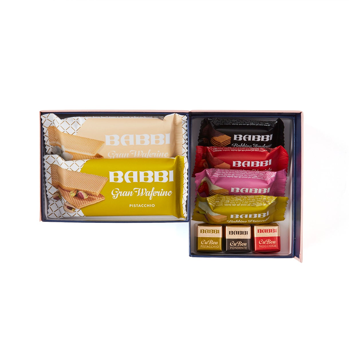 定番ウエハース『グランワッフェリーニ』に加え、季節限定チョコレートウエハース『バッビーノ』、クリームをチョコレートで包んだ『クボーン』を詰め合わせました。どれから味わうか迷う楽しさも詰まった、ひと箱で楽しむドルチェの宝石箱です。