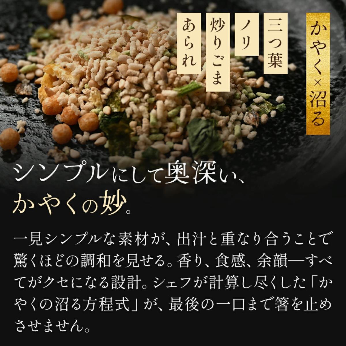 笠原シェフと焼津老舗の技術が融合し、“出汁×かやく×具材”の三位一体で生まれた究極のお茶漬け。