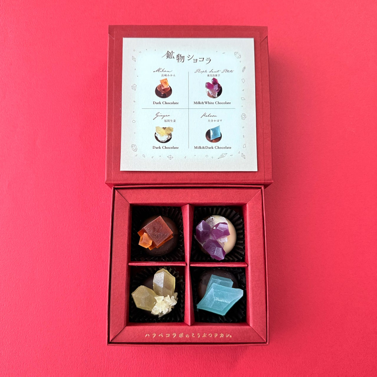 「ArtなFoodであそぶ」をテーマにプロダクトを展開するメルティングポットハラペコラボ株式会社(所在地:福岡県福岡市、以下 ハラペコラボ)から、九州各地の素材を使った鉱物みたいな琥珀糖「こうぶつヲカシ」が3種のチョコレートとマリアージュした「鉱物ショコラ」が期間限定で登場。バレンタインギフトにもぴったりの赤いボックスでご用意しました。2026年1月16日より公式オンラインストアにて販売を開始しました。