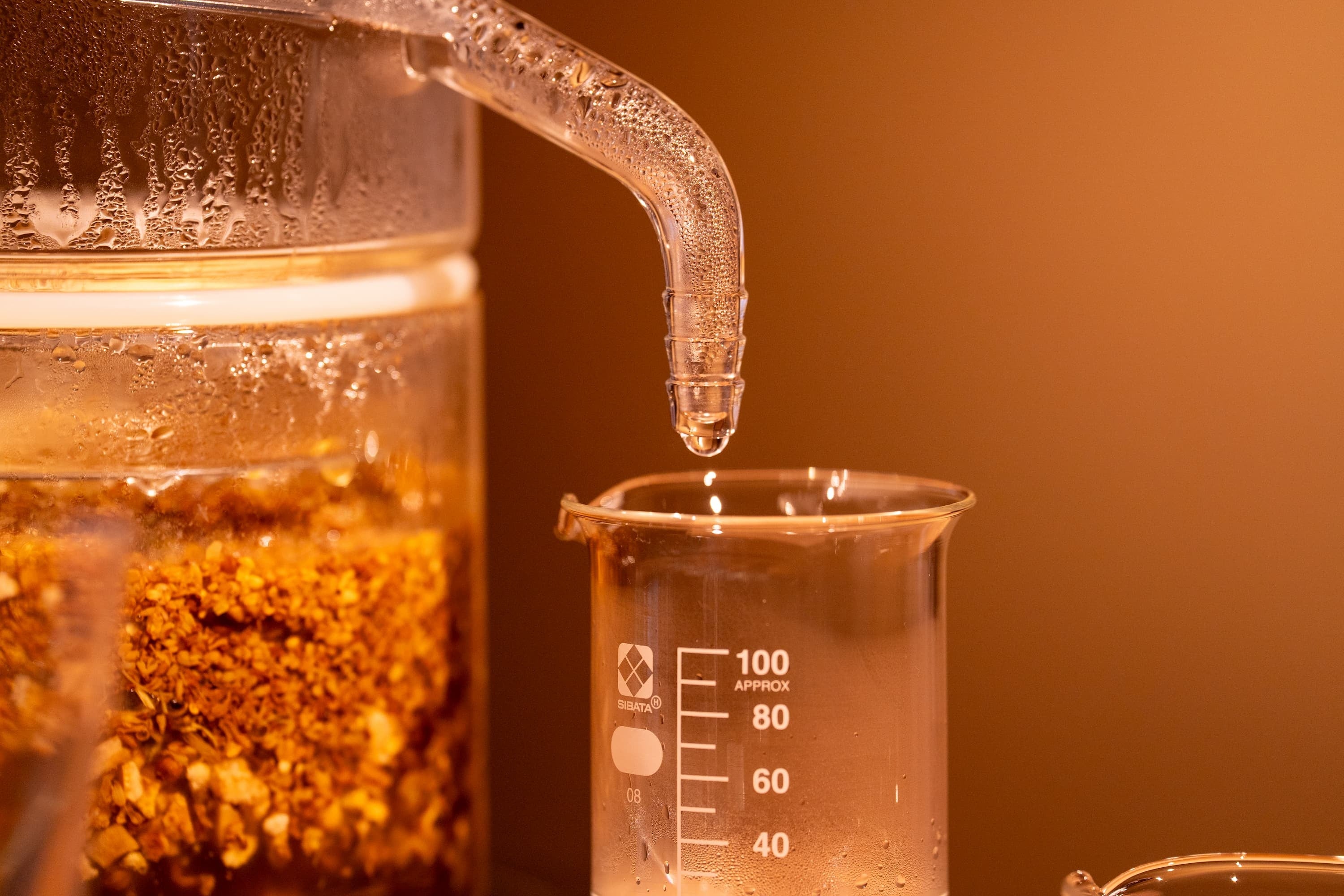 蒸溜という工程は、単なる製造技術ではなく、香りが立ち上がっていく過程そのものを感じ取る行為だと私たちは捉えています。植物に含まれる香りが、熱と時間を通して少しずつ姿を変え、液体として集まっていく。その変化を目で追い、香りを嗅ぎ、場の空気の変化を感じることが、蒸溜の本質です。