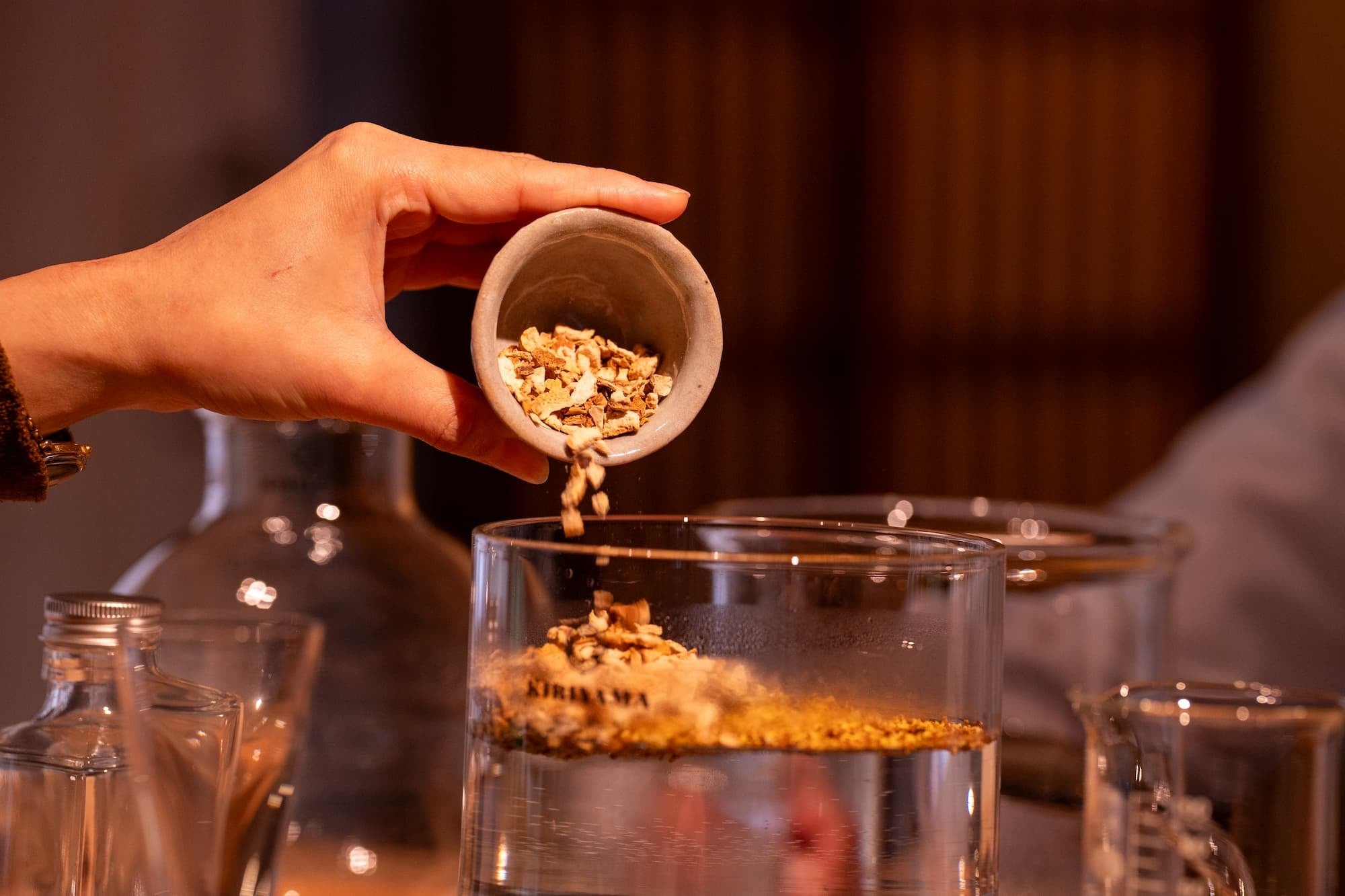 私たちは日々ノンアルコールスピリッツを製造する中で、季節の移ろいや植物の状態を感じ取っています。蒸溜中に立ち上がる香り、抽出の進行とともに変化する空気、時間の経過によって生まれる間。そのすべてを含めて体験していただきたいという思いから、この体験教室を始めました。