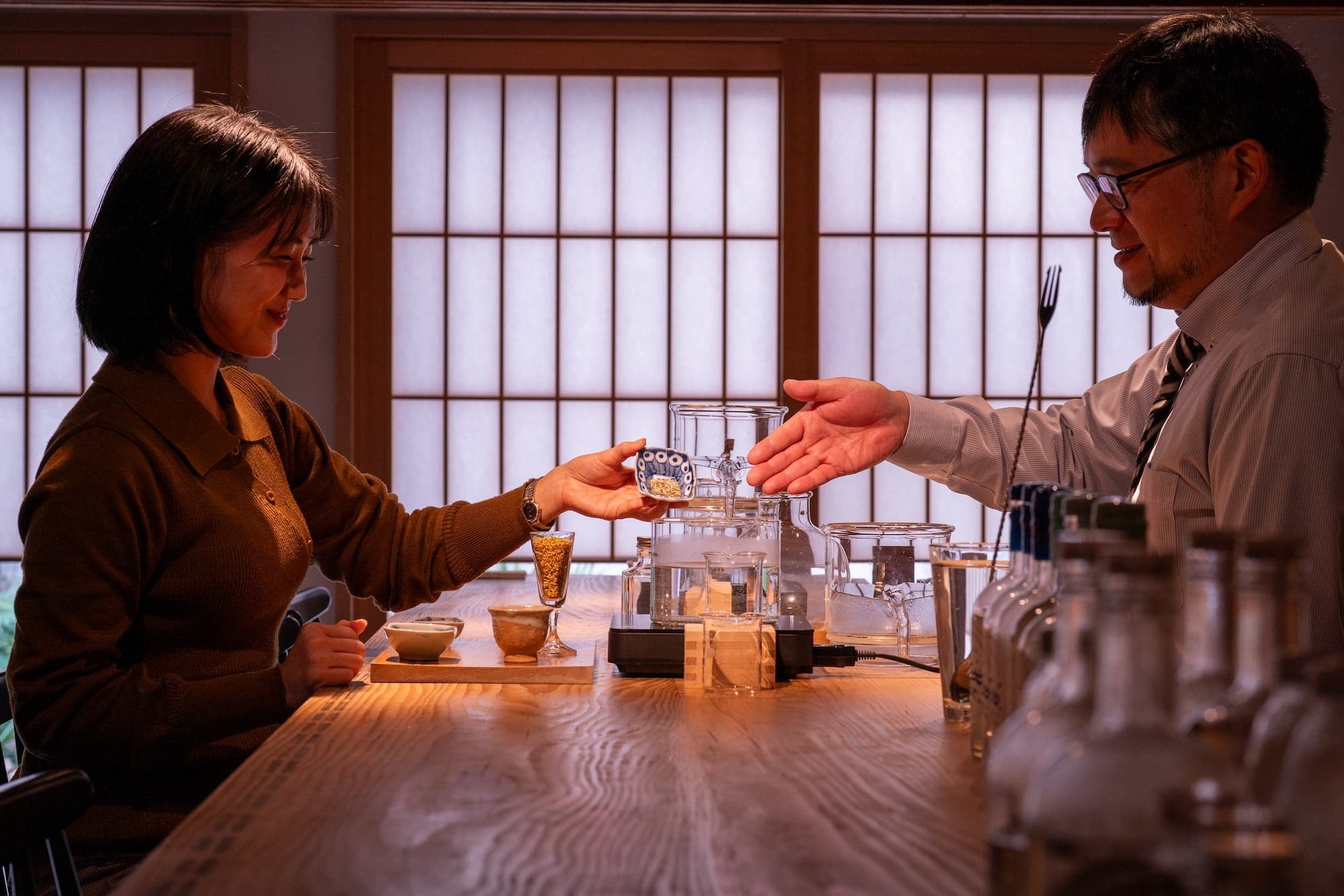京都の町家空間で、木や土、紙といった素材に囲まれながら過ごす蒸溜の時間は、香りだけでなく、空間や音、気配を含めた体験として立ち上がります。