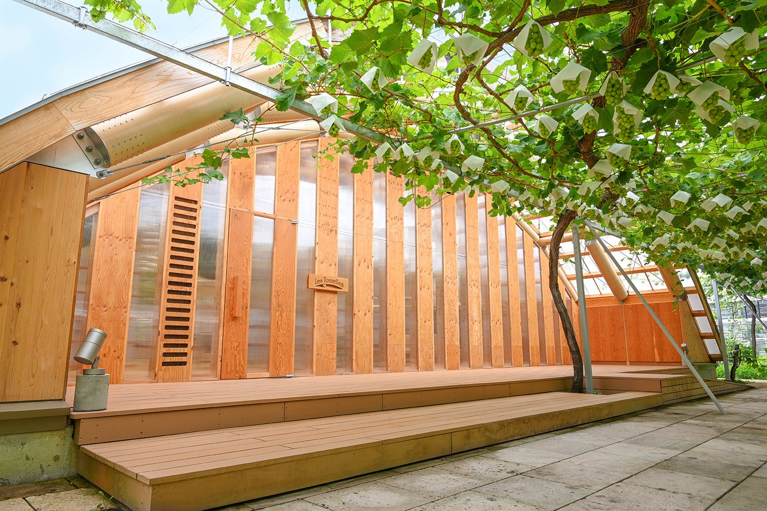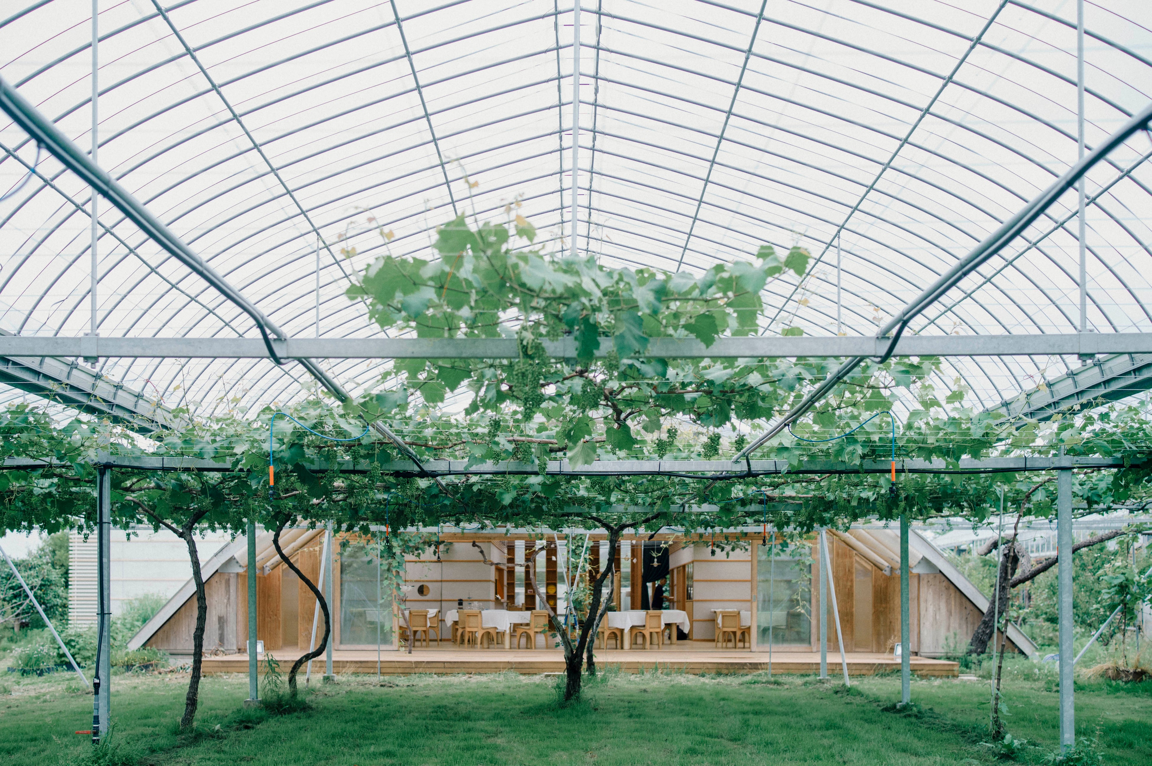 再生可能な紙管を構造材に用いた、温かみと力強さが共存するデザイン。周囲の緑を存分に取り込む設計により、屋内にいながらにして農園の土の香りや風の気配を身体全体で感じることができます。