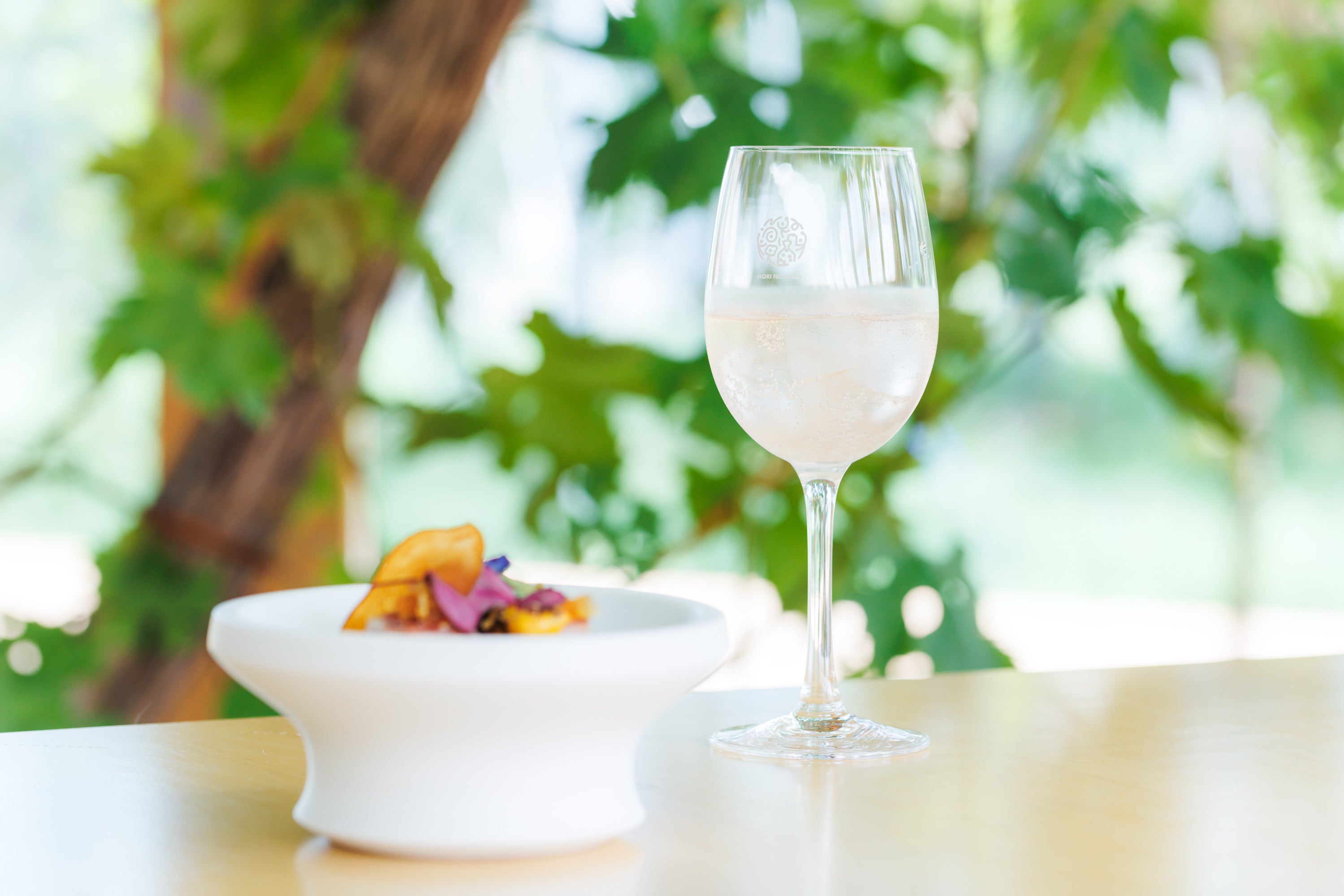 直営の蒸留所でつくる「MORI NO NIWA」のドリンクをお食事にあわせて提供いたします。「MORI NO NIWA」は周辺に広がる耕作放棄地を再生して栽培した草花を原料にしたぶどうの森の新しい飲料ブランド。土地の記憶を語るようにドリンクは料理と共鳴し、食体験をより豊かに、鮮やかに昇華させます。この独創的なペアリングは、国内外の美食家からも高い評価をいただいており、私たちの蒸留所設立の原点ともなっています。