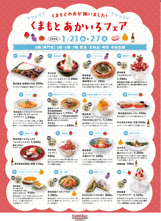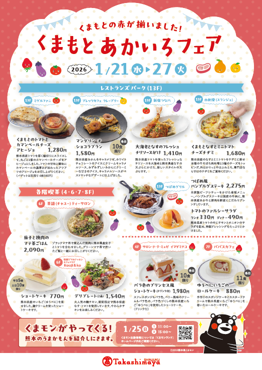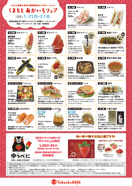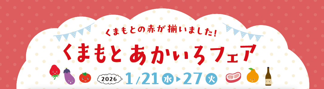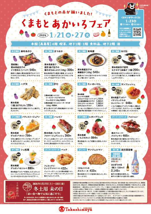 熊本県(知事:木村 敬)は、2026年1月21日(水)から1月27日(火)まで、新宿高島屋と柏高島屋にて「くまもとあかいろフェア」を開催いたします。期間中は、熊本県が誇る新鮮な農林畜水産物や加工品、県産酒などが各フロアに勢揃いし、多彩なラインナップで熊本の食の魅力をお届けします。また、熊本県営業部長兼しあわせ部長「くまモン」も応援に駆けつけ、会場を盛り上げます。