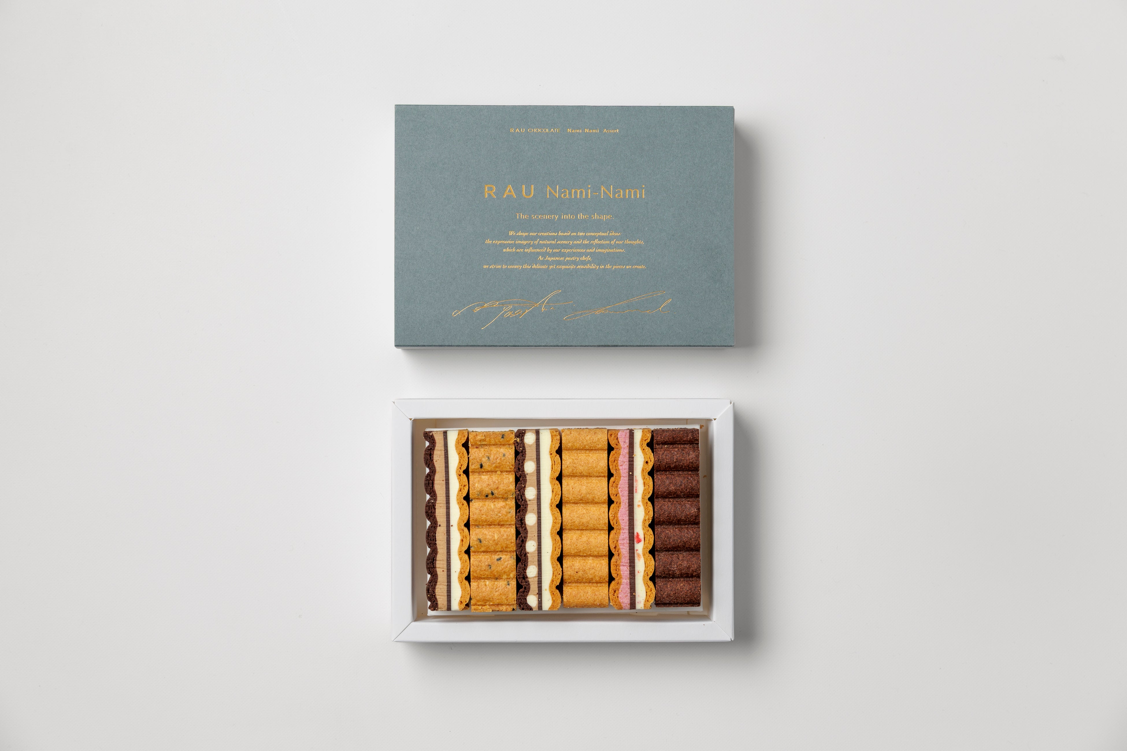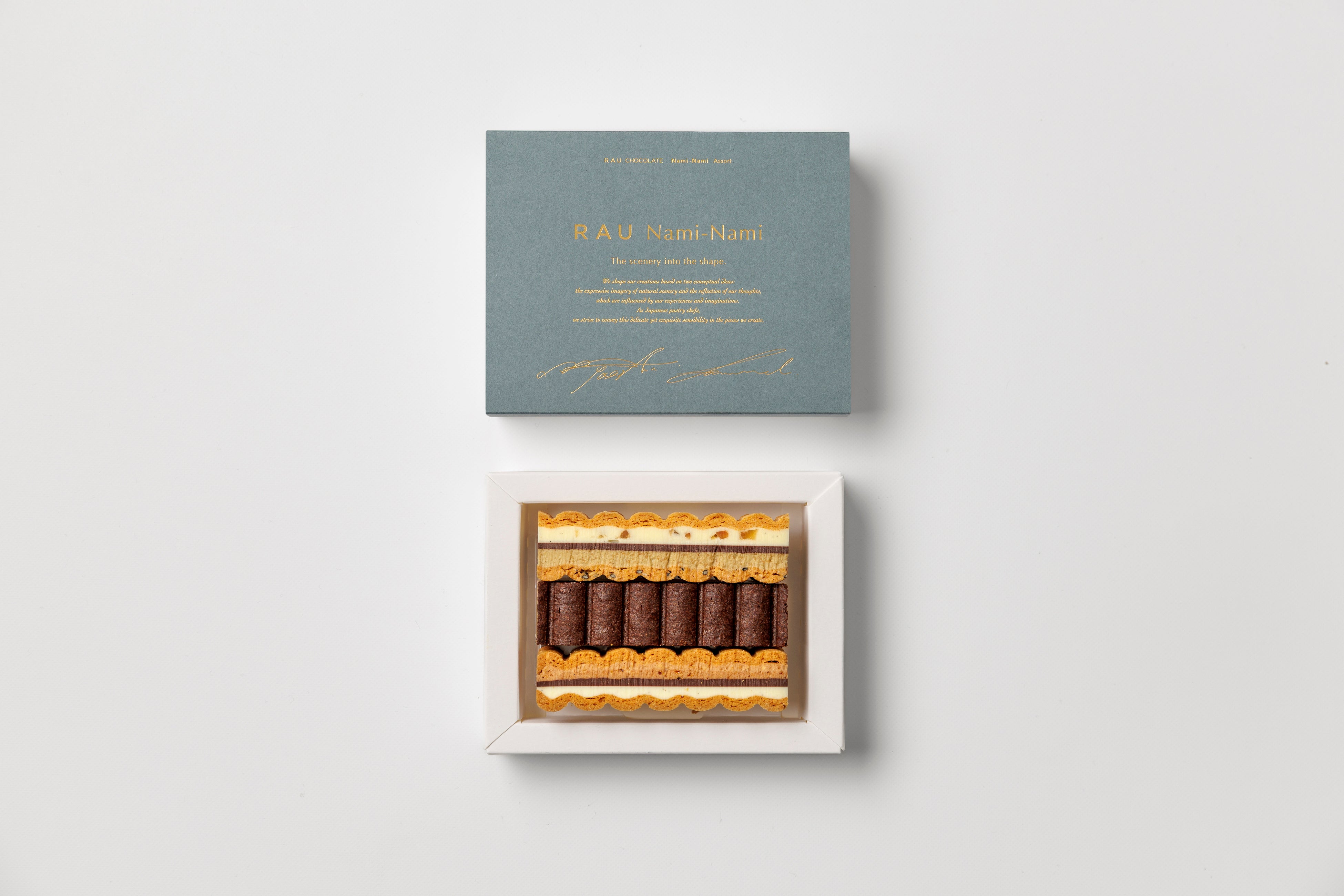 RAUの人気商品「Nami-Nami」の新フレーバー「カフェオレ」を含む3種の限定アソートボックス。限定パッケージはブルーグレーにゴールドの箔が入った高級感のある仕上がりでギフトに最適です。