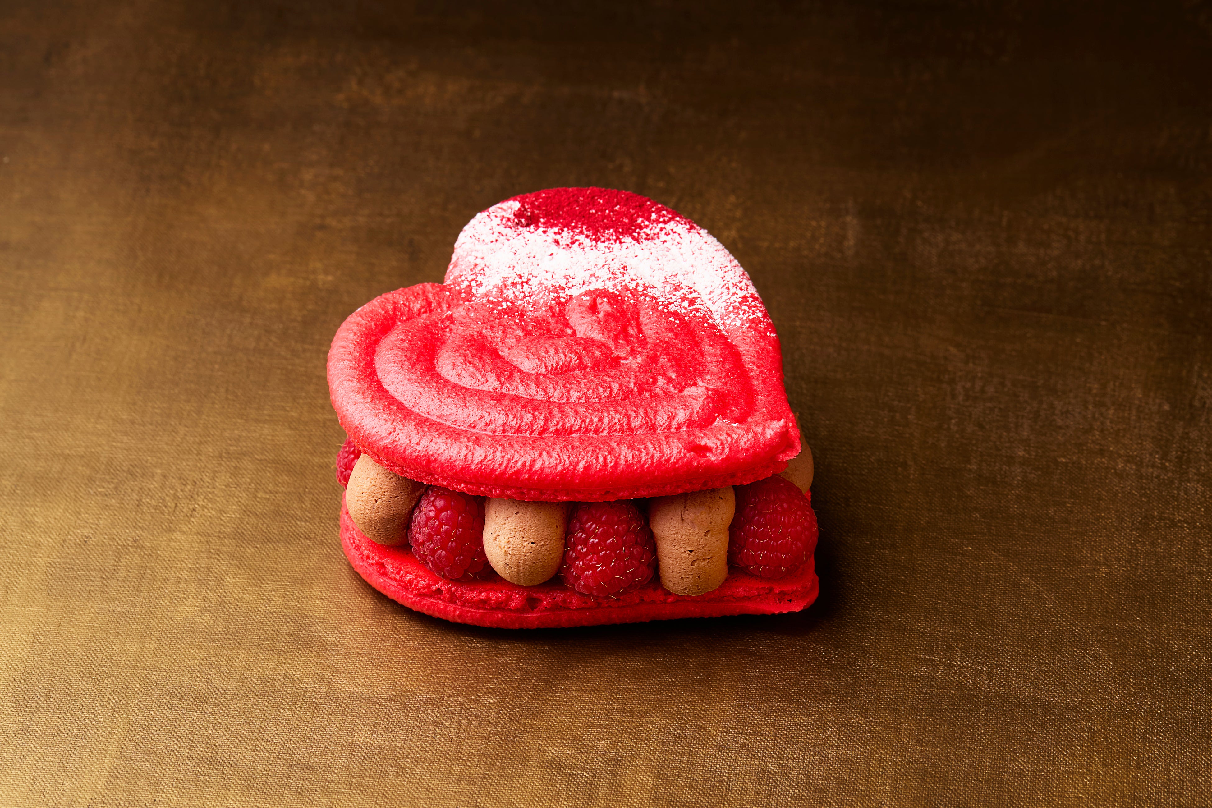 チョコレートガナッシュケーキを大きな赤のハートマカロンではさみ、周囲をラズベリーとチョコレートディプロマットクリームで飾りました。中には、シャングリ・ラ オリジナル ヒマラヤンブレンドティーガナッシュ、ガトーショコラ、チョコレートクリームと、ローズ香るいちごとラズベリーのジューシーなコンフィチュールを忍ばせて。