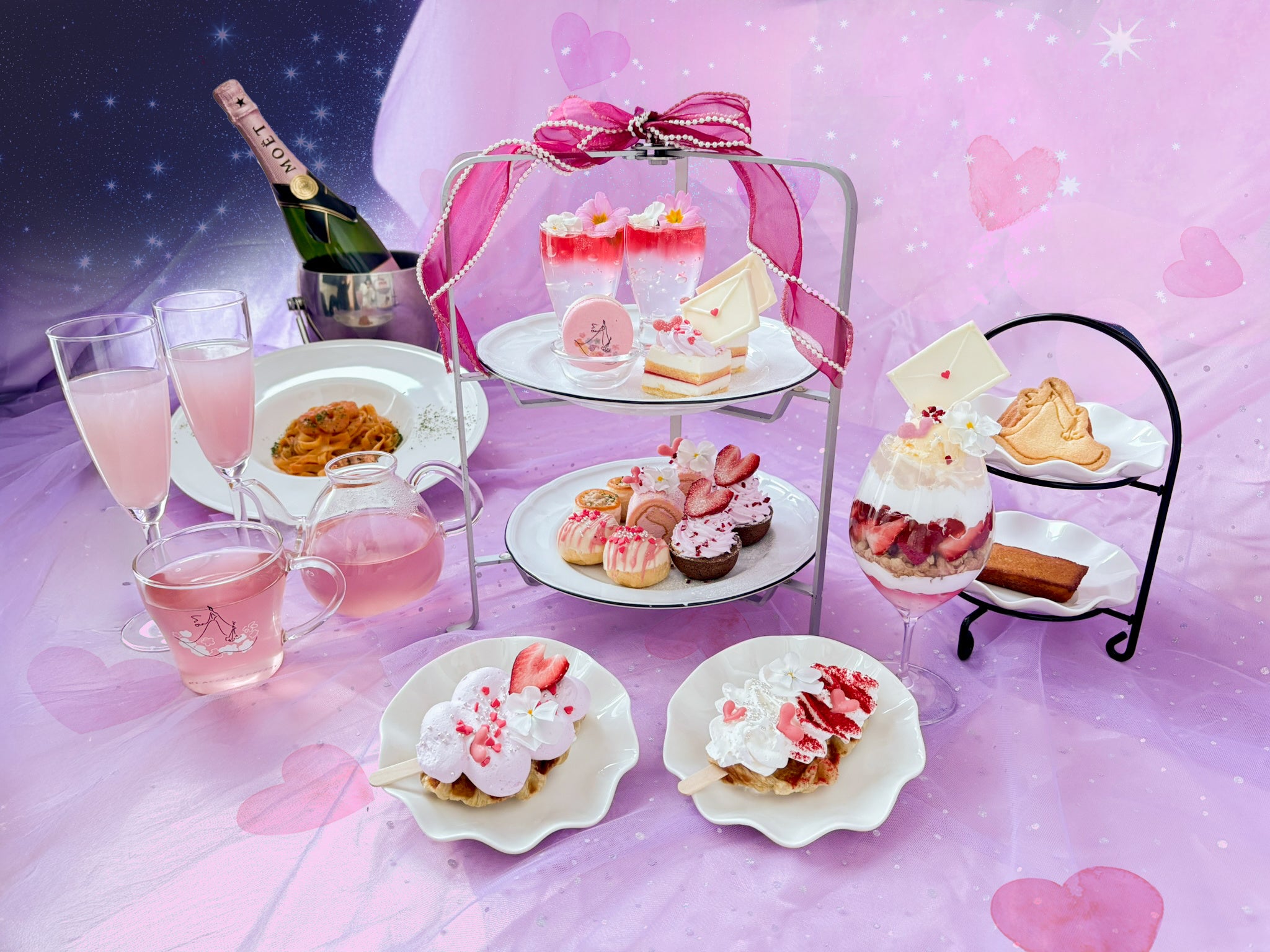 華やかなドレス装飾を間近に感じられる店内で、優雅なひとときをお過ごしいただける『お花のアフタヌーンティーセット』。バレンタインをイメージした、ハート型のいちごがのったタルトや、ストロベリーシロップを使用したきらめくオリジナルゼリー、ハートが散りばめられたシュークリームに、ピンクで彩られたロールケーキなど、物語の世界を思わせるキュートなスイーツがティースタンドを彩ります。さらに、ラブレターが可愛らしいショートケーキや、ジャムが隠し味のオリジナル“ジュレマカロン”もセットに。バレンタインの世界観を存分に感じていただける、シーズン限定のスペシャルなアフタヌーンティーです。
