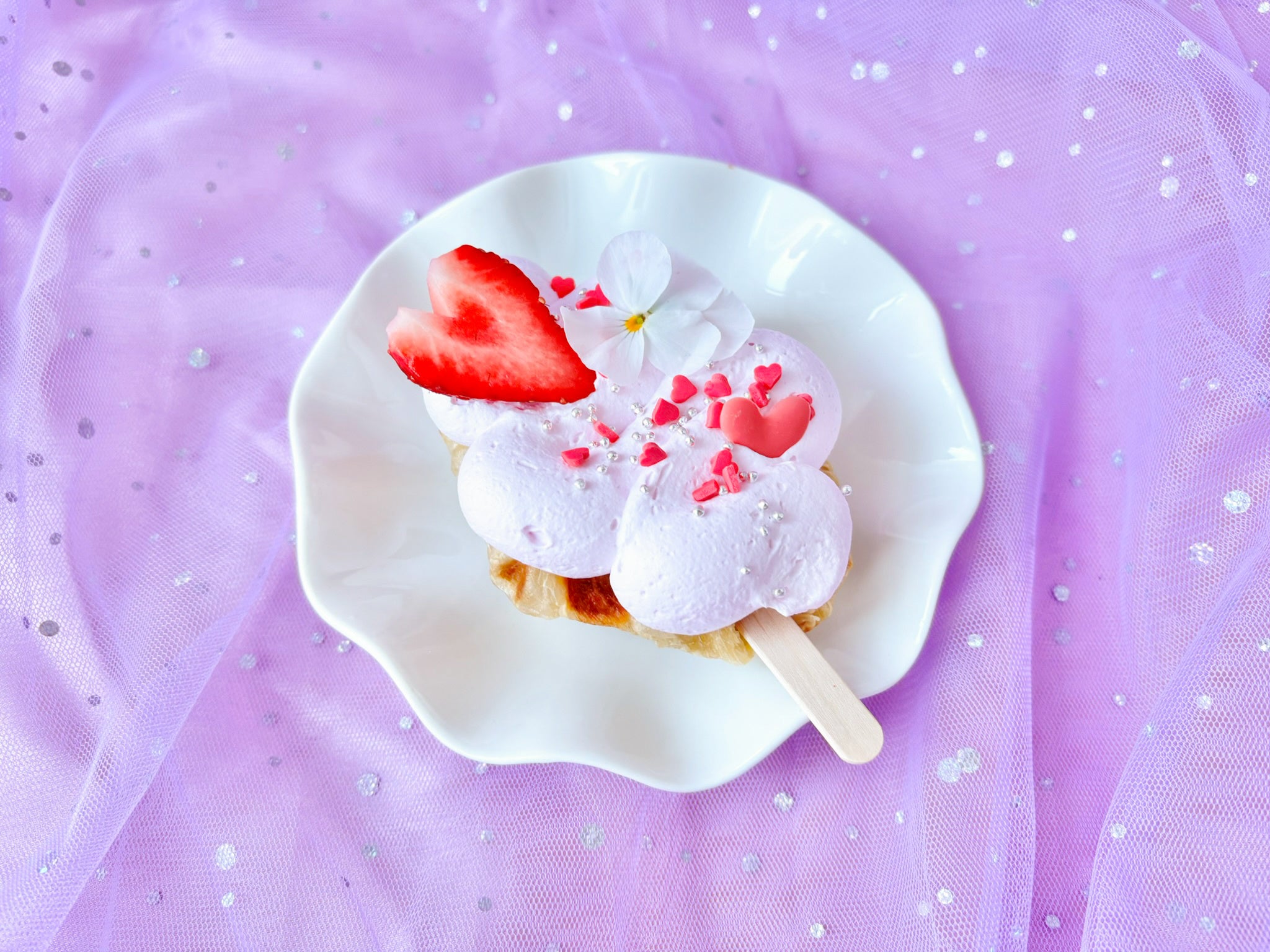 ふわっと甘酸っぱいストロベリークリームの上にハート型のいちごとシュガー、アラザンのきらめきで彩りを加えた一品。思わず笑顔になる、今だけのご褒美クロッフルです。