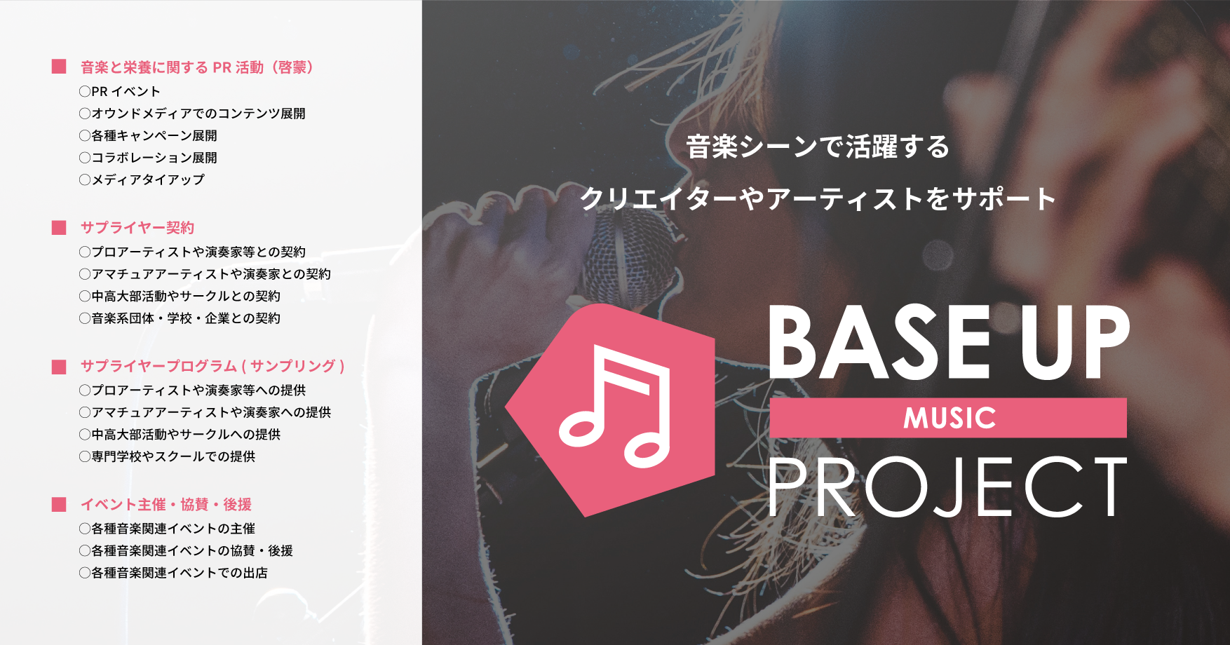 音楽活動の“ベースアップ”をサポートする取り組みとして、歌手、アイドル、演奏家、作曲家など、各種音楽シーンで活躍する個人・団体に向けた「BASE FOOD」商品の提供等、各種サポート活動を実施いたします。