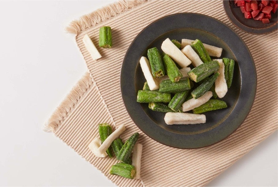 スティックタイプにカットされたオクラと長芋。特にオクラは見た目がオクラそのもので、サクッとカリカリ感が特徴。長芋はオクラに比べて硬めで、ザクザク歯ごたえのある食感です。