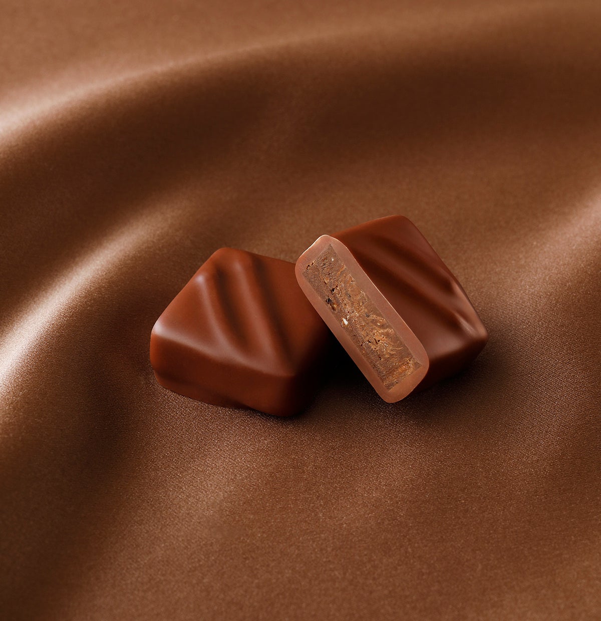 とろりとしたキャラメルクリームでガナッシュをサンドし、外はパリッと、中はなめらかにとろける食感が特徴。