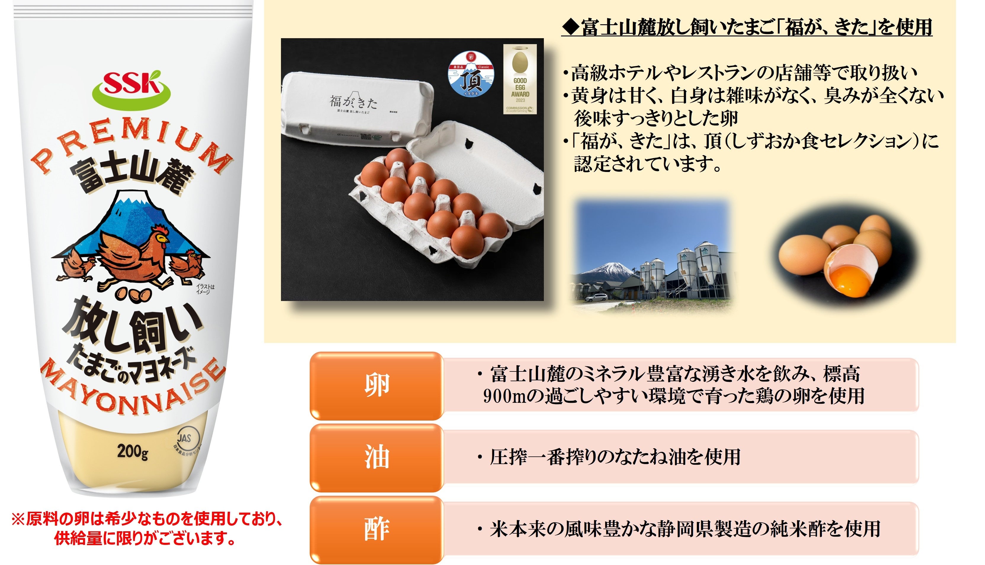 「SSK 富士山麓放し飼いたまごのマヨネーズ」は、富士山麓の恵まれた環境で過ごす鶏が産んだたまごのコクとうまみを活かしたマヨネーズです。
