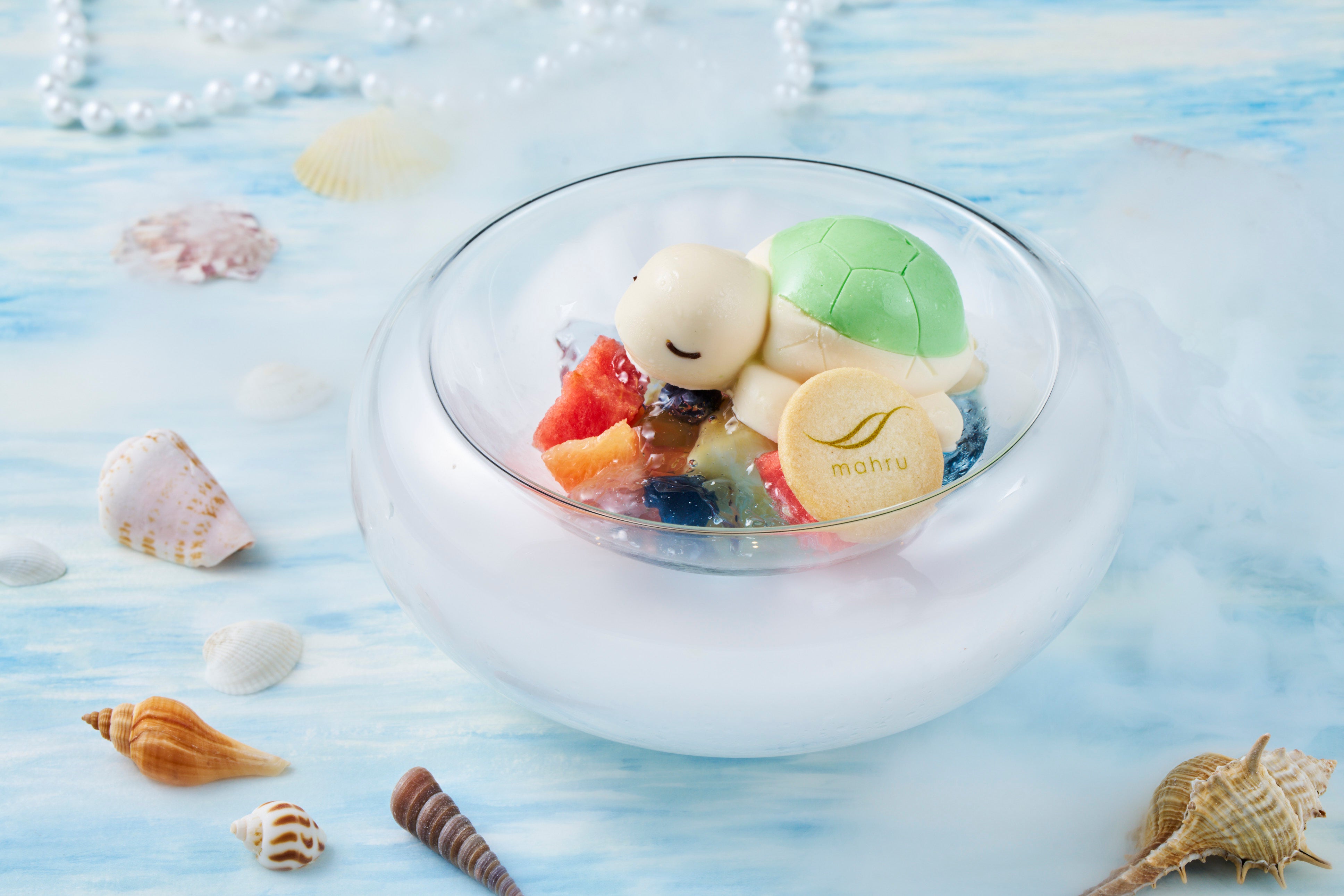 沖縄の海を優雅に進むウミガメは、甘さ控えめでやさしいバニラの香りが広がるホテルメイドのバニラアイスで表現しました。海面のきらめきを思わせるエメラルドグリーンのゼリーは優しい甘みで仕上げ、ゼリーでマリネした数種類の旬のフルーツは、北谷の海を泳ぐ色とりどりの魚のように鮮やかな彩りを添えます。フルーツの自然な甘みとゼリーの透明感が重なり合う爽やかな味わいに、砂浜をイメージしたロビーラウンジ「マール」ロゴ入りのオリジナルクッキーが心地よい食感をプラス。ひと皿の中で、北谷の海の風景を“見て・味わう”体験をお楽しみいただけるスイーツです。