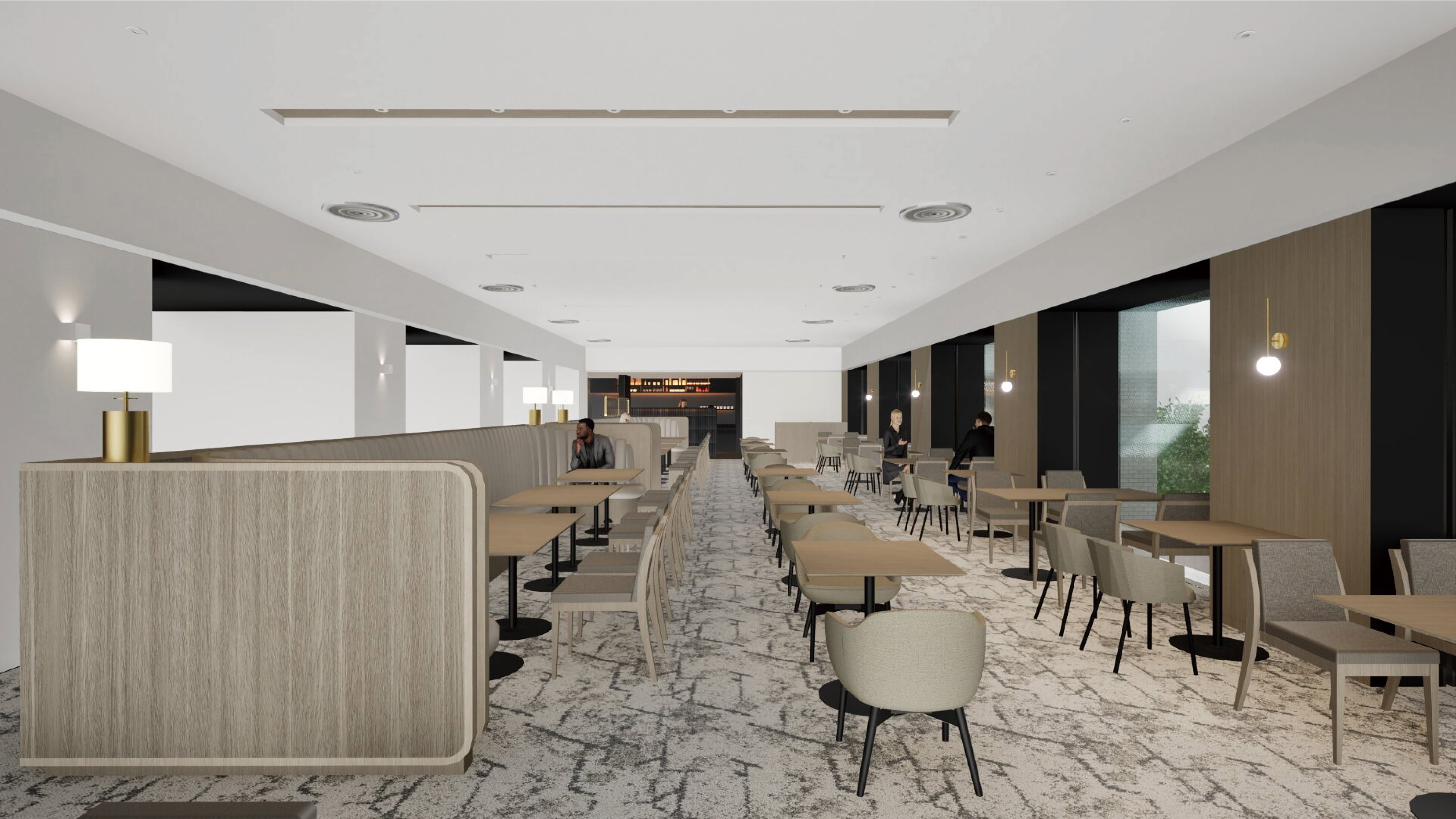 白を基調としたホール席は、神戸港を望む大きな窓から自然光が差し込む明るい空間。柱の木目にゴールドを使用するほか、アクセントにグレージュとダークグレーでまとめたテーブルとイスを設置します。さらに、半個室を設けることで、ご家族でのお食事やビジネスシーンなど、より多様なご要望にお応えします。また、エントランス横にはテイクアウトコーナーを設け、ホテルメイドのケーキやパンをはじめ、ご自宅用から手土産まで幅広くご利用いただける商品をご用意しています。