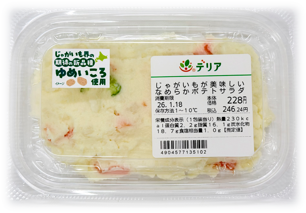 デリア食品が採用する「ゆめいころ」は、長年愛されてきた「男爵薯(だんしゃくいも)」を母に持つ、シストセンチュウ抵抗性を備えた新品種です。その名はアイヌ語で「宝物」を意味します。 男爵薯同等のおいしさを持ちながら、より「しっとり」とした食感で煮崩れしにくく、ポテトサラダなどの調理に適しています。また、表面の凹凸が少なく目が浅いため、加工しやすい点も大きな特徴です。