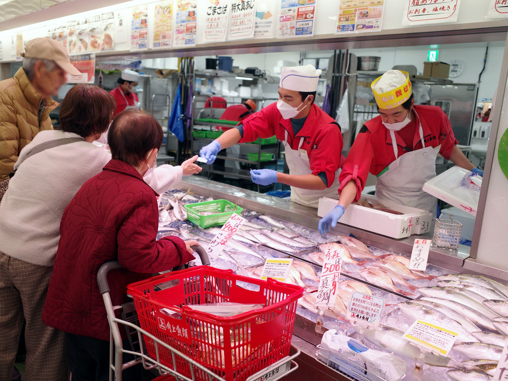 角上魚類では、知識豊富な「親切係」という魚のコンシェルジュのようなスタッフを全店に配置しております!魚の特徴や美味しい食べ方、身おろしのアドバイスなど、お客様においしく魚を召し上がって頂けるようにサポートしています。