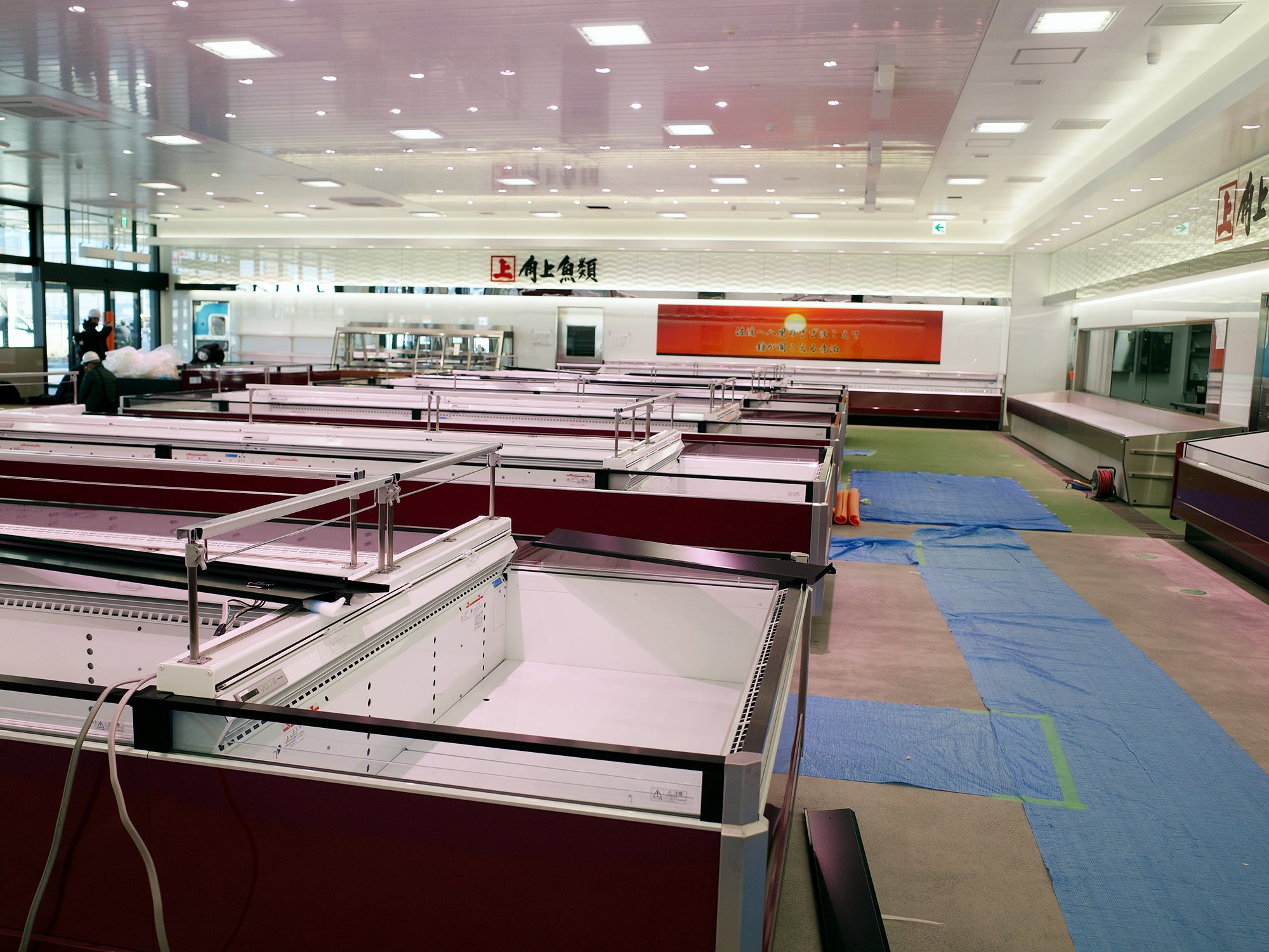 2月19日(木)開店する狭山店は、角上魚類の代名詞ともいえる対面売り場を中心に、寿司、刺身、惣菜ほかをそろえた、近年の角上魚類スタンダードともいえる売り場設計です。そして最近の角上魚類新築店舗の傾向として、バックヤードには十分な広さを備えた、安全性や衛生管理に配慮した構造となっています。