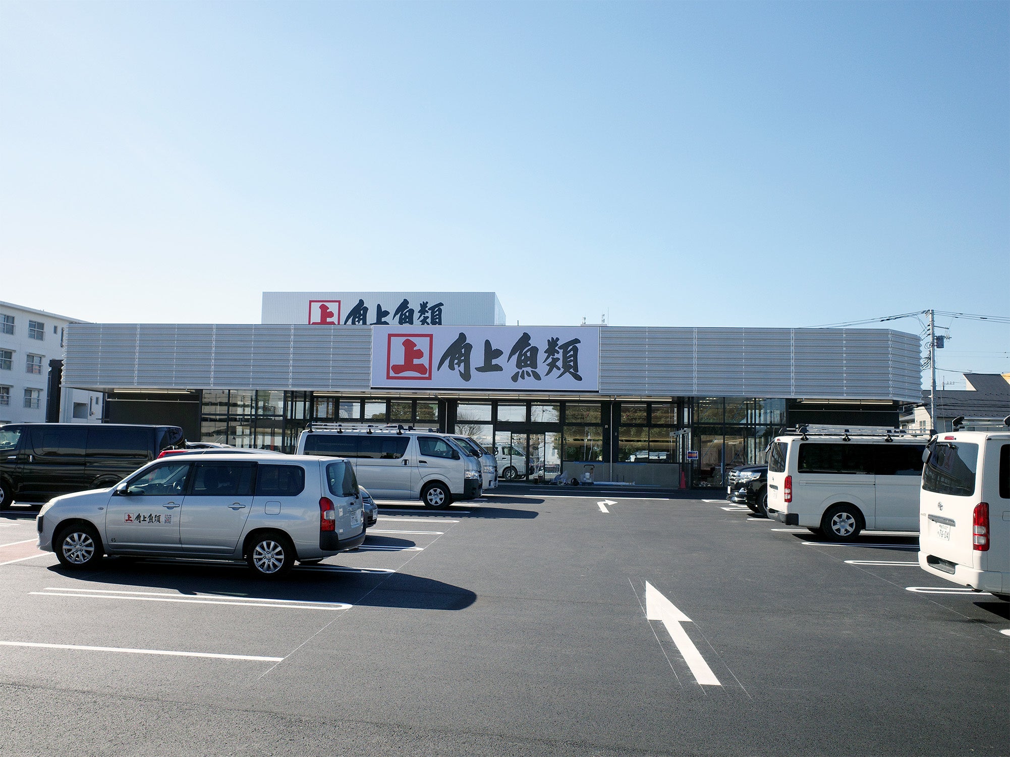 角上魚類 店舗の形態には商業施設へのテナント出店やロードサイドへの大規模型独立型出店があります。特にロードサイドへの出店型は、丸ごと一匹の鮮魚が幾種類も並び、お客様と直接会話を交わして販売する、角上魚類の代名詞とも言える「対面販売」をメインに、600点を超える魚介関連商品を売場に展開いたします。