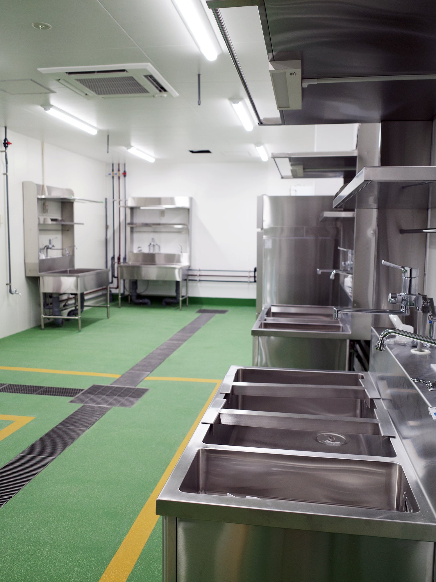 鮮魚を丸ごと販売し、お客様のご要望にそって身おろし調理する対面売場では、多くのご注文が同時に入ったとしてもスピーディに要望にお応えできるように、そして刺身の製造では丸ごとの魚から盛合せを作ることができるように、とそれぞれの部門によっていくつものシンク台が必要になるのが、私たち角上魚類の基本的な営業スタイルであるからです。