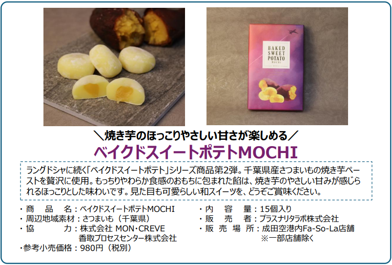 NAAグループでは、地域の魅力・資源と成田空港のシナジー効果の最大化を目指して新たな地域振興に取り組んでおります。その取り組みの一環として、プラスナリタラボ株式会社は、千葉県産の焼き芋ペーストを贅沢に使用した「ベイクドスイートポテトMOCHI」を1月23日(金)から発売します。