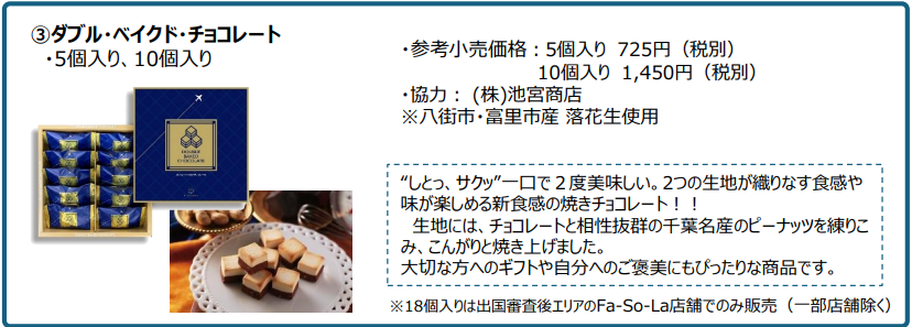 ※ダブル・ベイクド・チョコレート(5個入り・10個入り)、ダブル・ベイクド・チョコレート抹茶については、Fa-So-La店舗以外で以下の店舗でも販売しております。