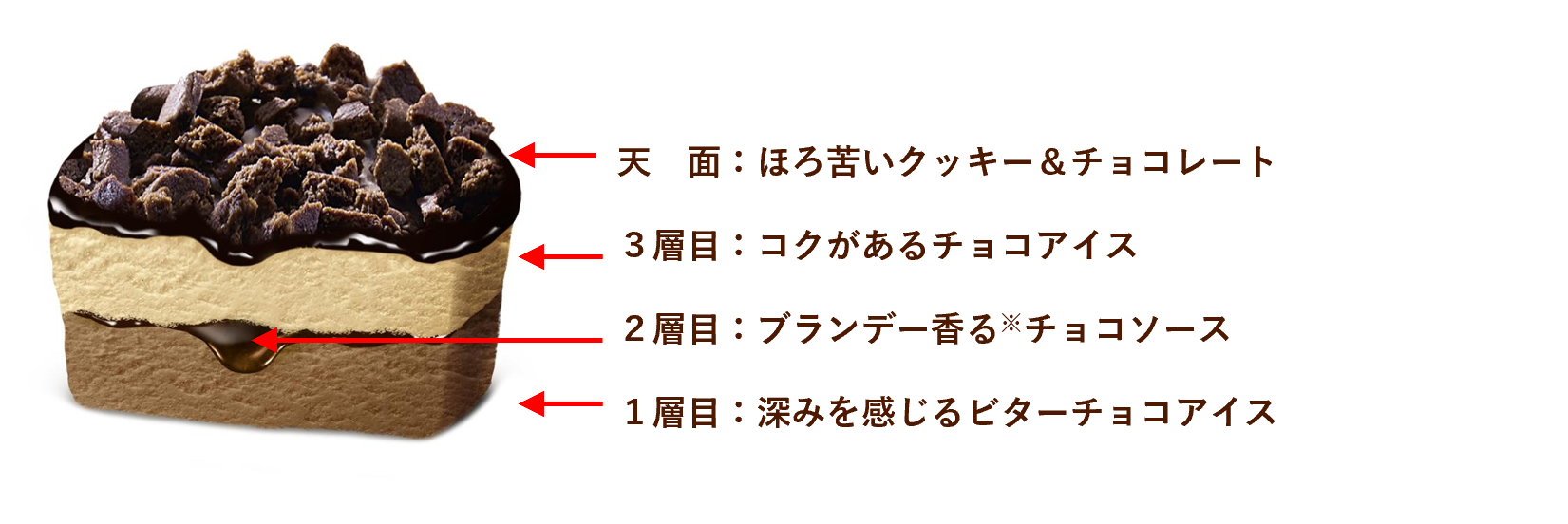 深みを感じるビターチョコアイスとコクがあるチョコアイスの間にブランデー香る※チョコソースを挟み込み、天面には食感のアクセントになるクッキーとチョコレートを敷き詰め、よりしっかりとした食べ応えに。