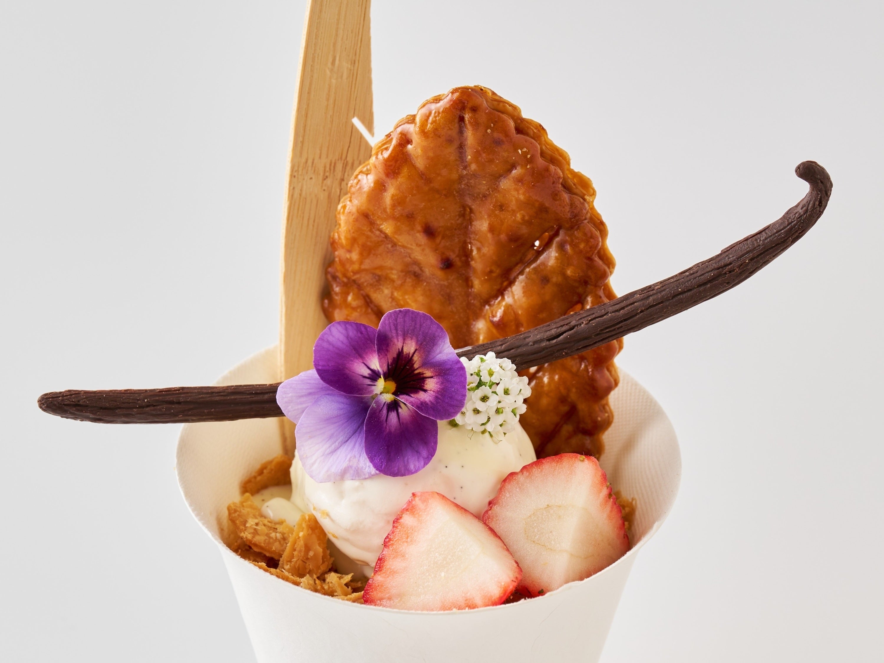 リーフパイ、カスタード、ジェラート、ソースなどにラン科のバニラを使用し、豊かな香りと味わいを幾層にも重ねたこだわりのミルフィーユパフェをイートインで提供します。彩りとアクセントとして苺を添えることで、バニラの奥深い風味を一層引き立てました。さらに、バニラビーンズを模したチョコレートをあしらい、バニラの世界観を表現した本展限定のスイーツです。