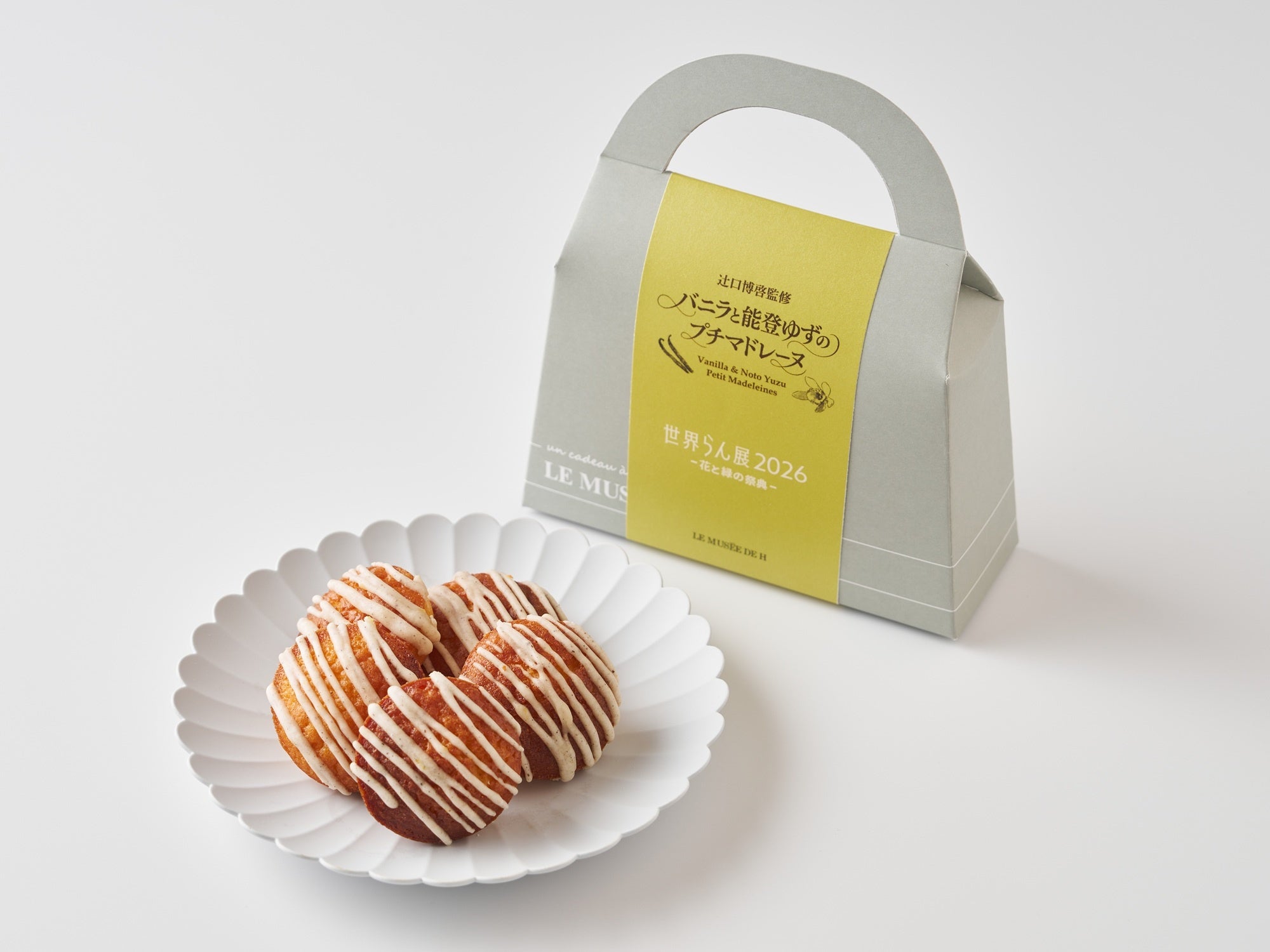 メイン食材のバニラをふんだんに使用し、贅沢で芳醇な甘い香りを演出。辻口さんの出身地・能登の柚子の果皮を加え、アクセントとしています。バニラと柚子の上品な香りとともに、しっとりと焼きあがったマドレーヌは来場記念のお土産として最適です。