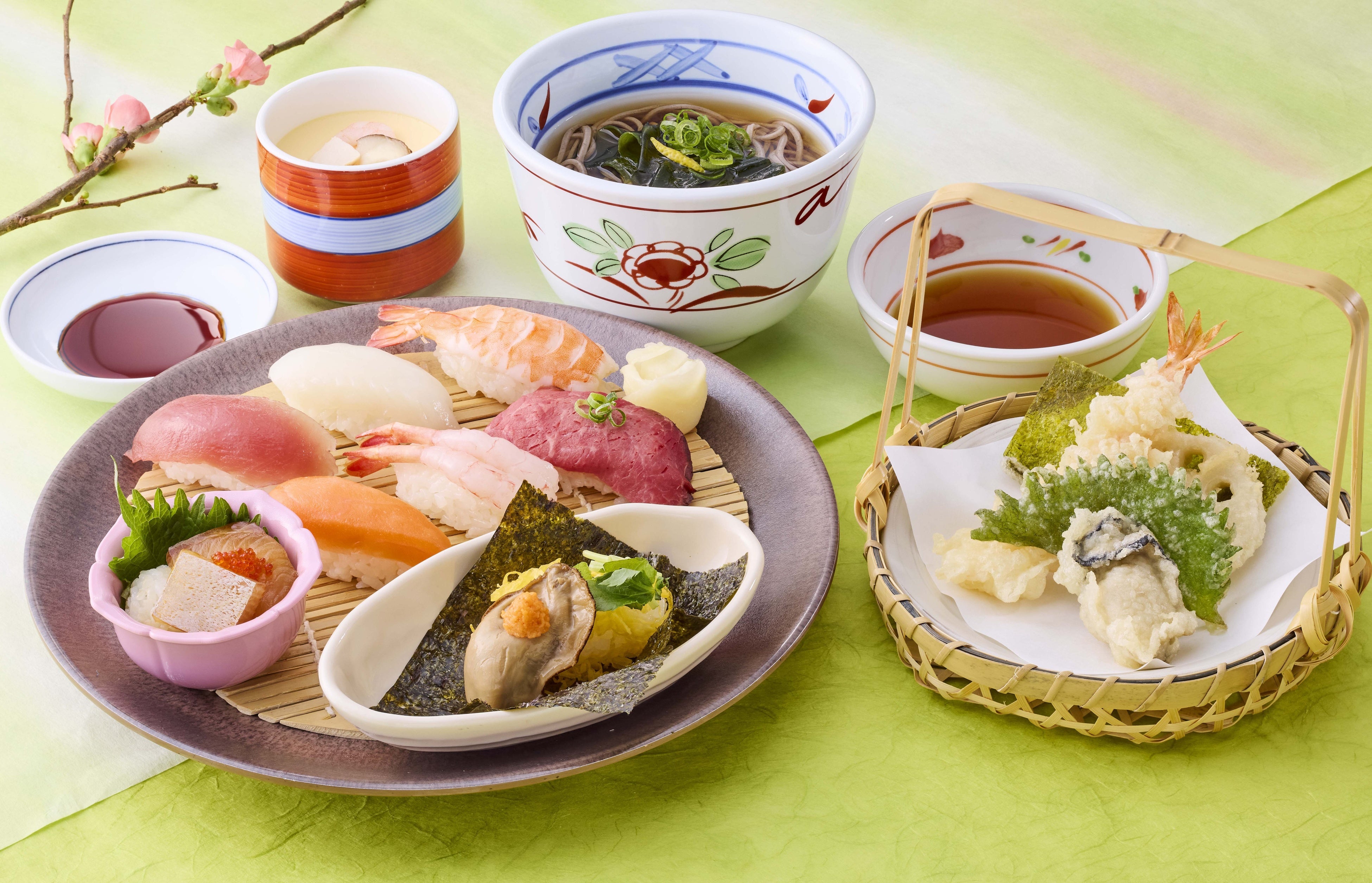 漬け鰤平や、牡蠣手巻き寿司に、まぐろやサーモンなどの人気の寿司を盛り合わせた寿司和膳です。牡蠣を使用した天ぷらが付きです。