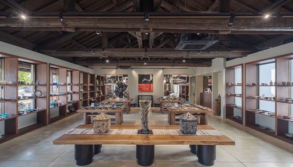 こけら落としでは、読谷村のみならず沖縄の陶芸文化に多大な功績を残した、故・金城次郎氏をはじめ現在も次郎窯にて創作活動を続ける作家の作品を展示販売する「金城次郎窯一門展」を開催中。(1/20~2/11)